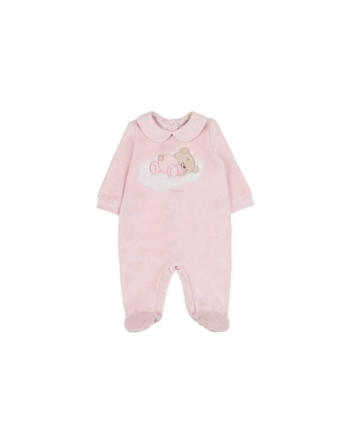 Deliziosa tutina in ciniglia, impreziosita dalla presenza di una tenera grafica con un orsetto che dorme su una soffice nuvola. Abbottonatura inferiore e posteriore.
