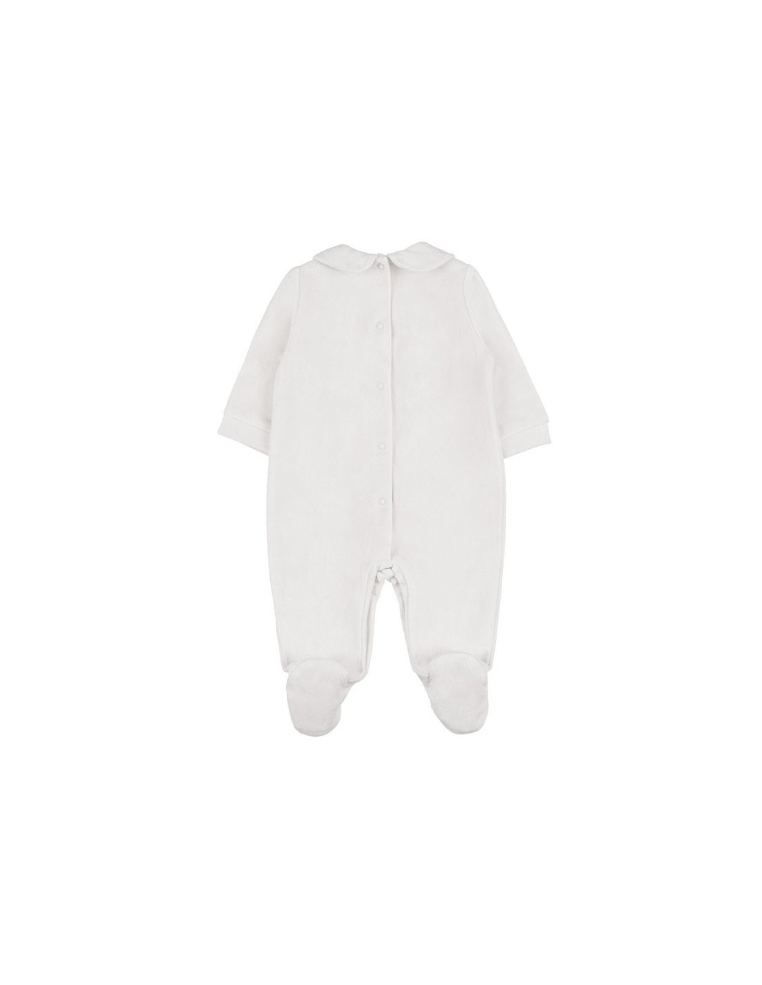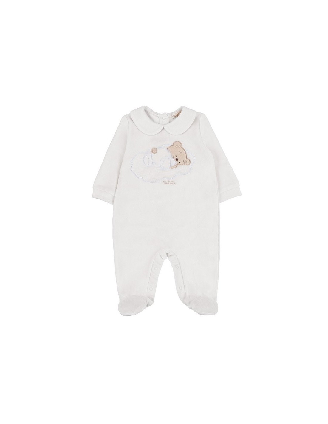 Deliziosa tutina in ciniglia, impreziosita dalla presenza di una tenera grafica con un orsetto che dorme su una soffice nuvola. Abbottonatura inferiore e posteriore.
