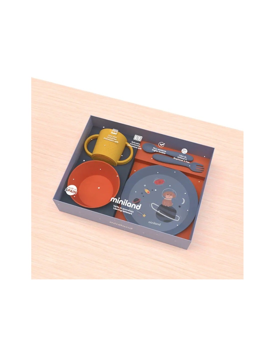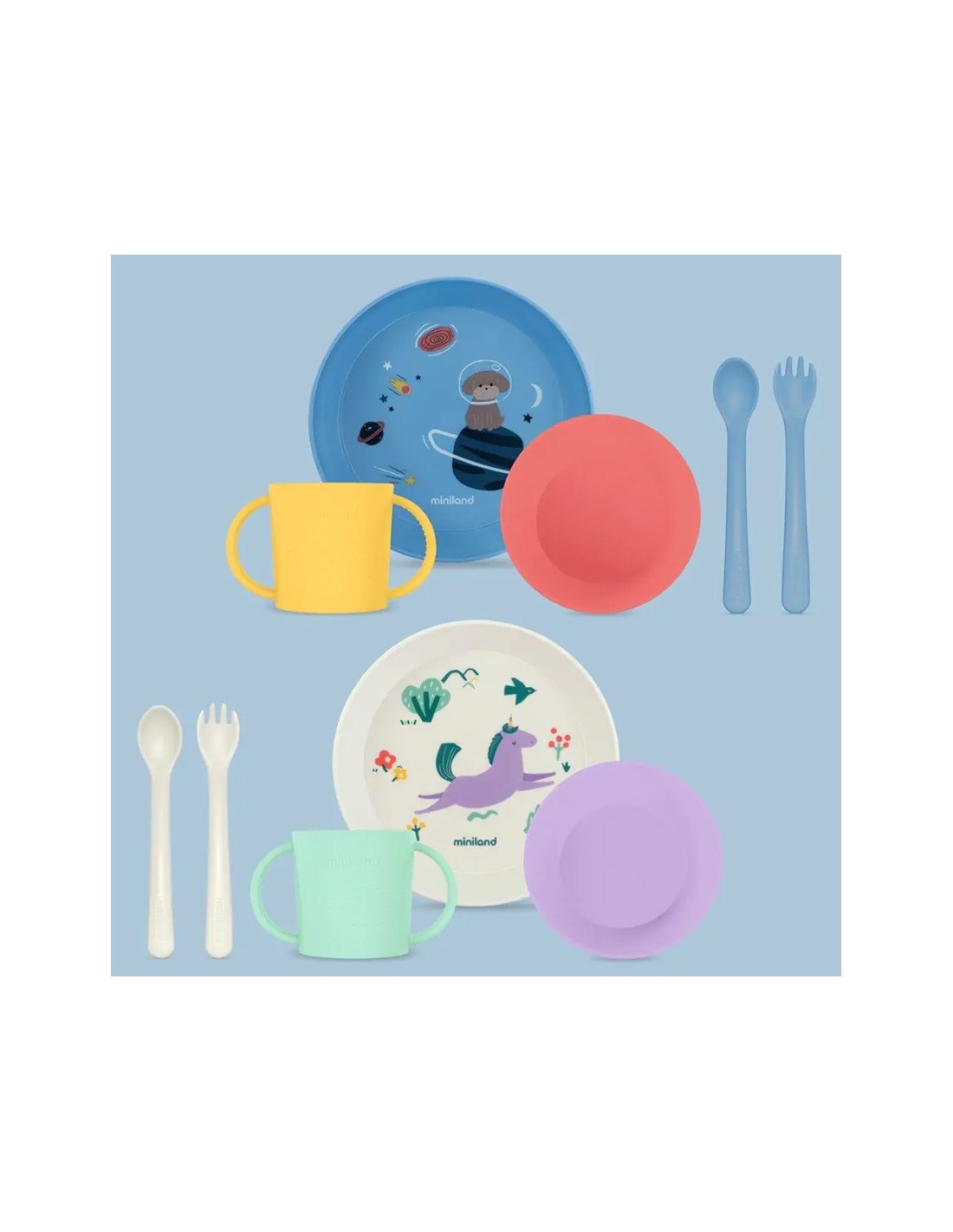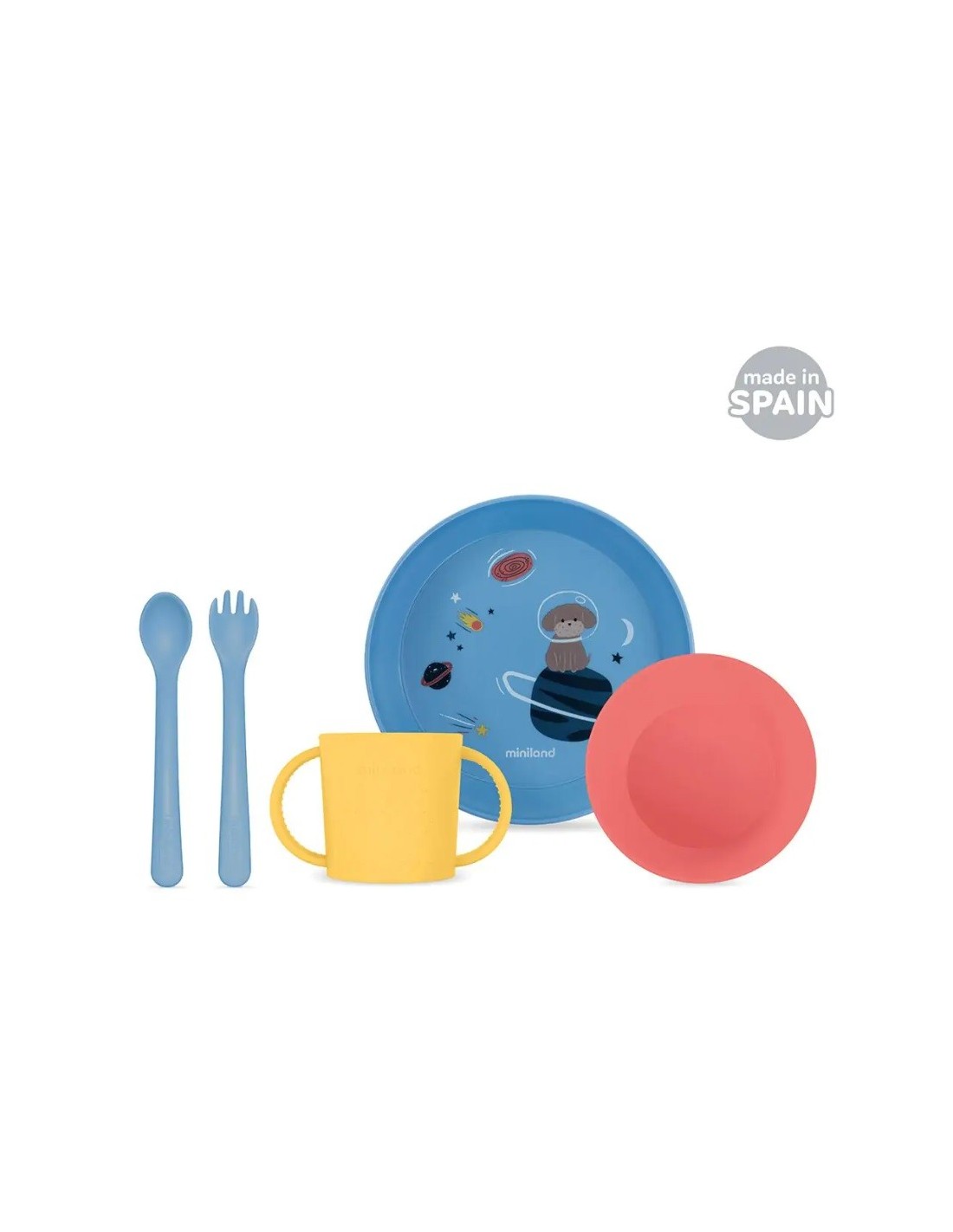 Il set include: 1 piatto decorato, 1 ciotola con bordi rialzati, 1 cucchiaio, 1 forchetta, e 1 tazza.