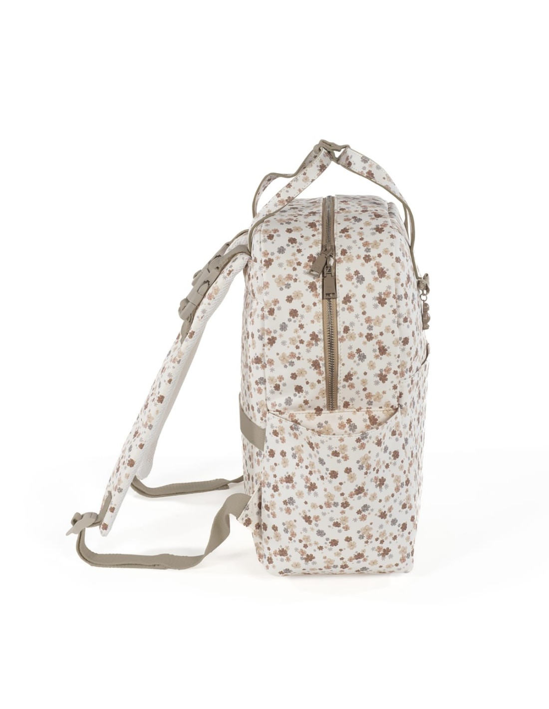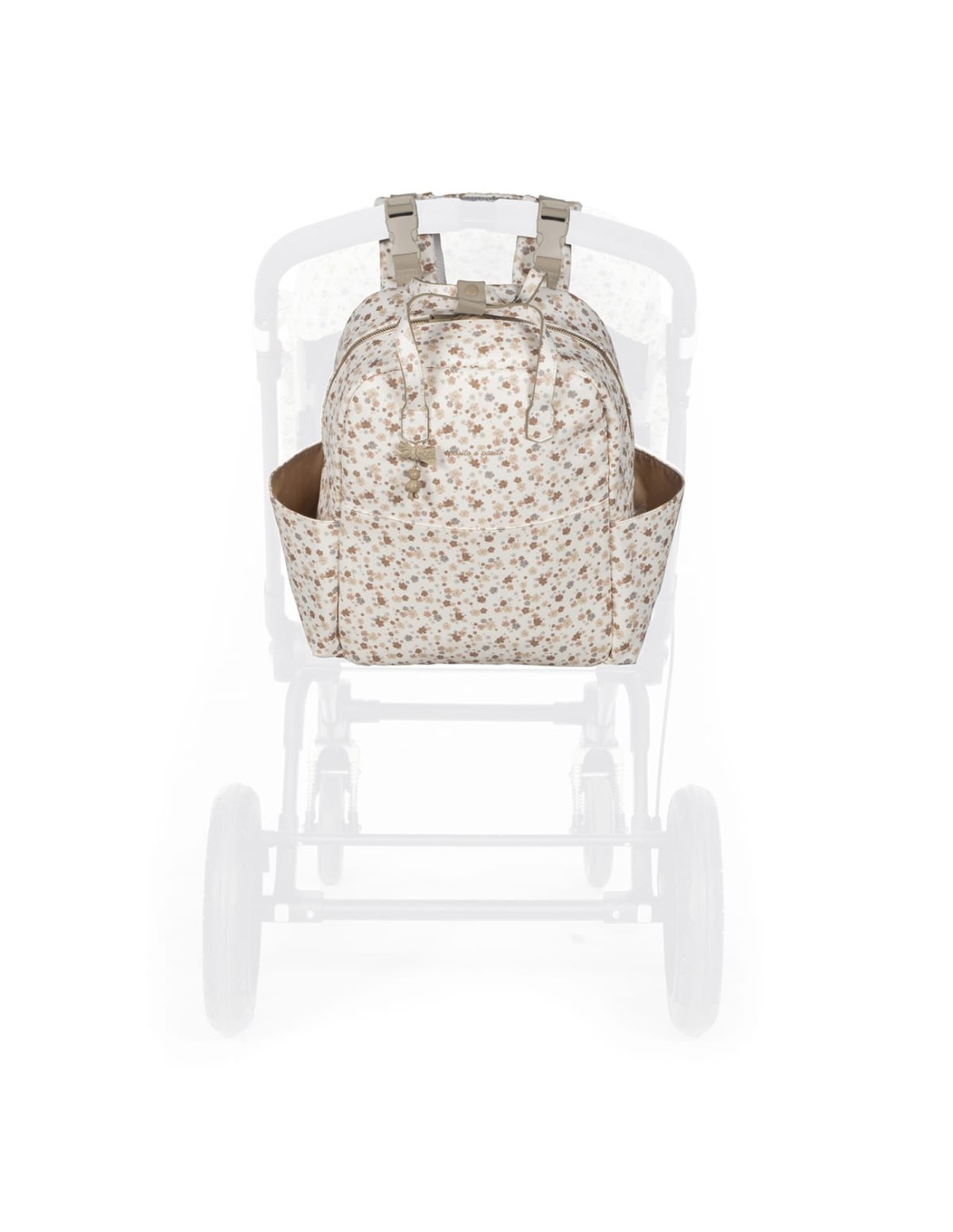 Dispone di una tasca interna termica per i biberon e di una tasca in plastica per i vestiti bagnati. Tasca esterna frontale e due tasche laterali per bottiglie o biberon. Dispone di 2 grandi maniglie regolabili per poterlo utilizzare appeso alla schiena, di maniglie per le mani e di due piccole maniglie per poterlo utilizzare appeso al carrello del bambino. È dotato di una cinghia posteriore per agganciarlo alla valigia del trolley
