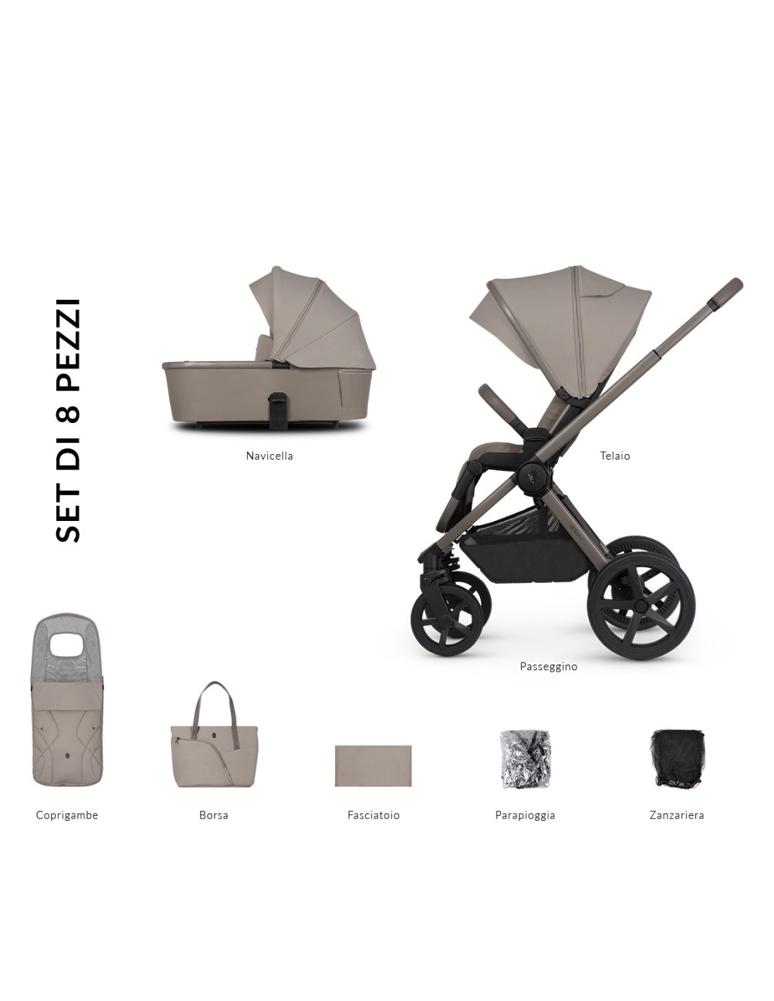 ACCESSORI INCLUSI NEL TRIO: coprigambe navicella, coprigambe passeggino, borsa, fasciatoio da viaggio, adattatori ovetto, parapioggia, zanzariera.