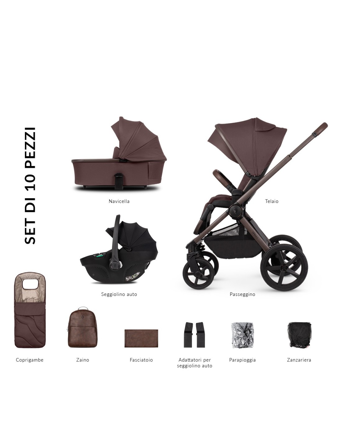 ACCESSORI INCLUSI NEL TRIO: coprigambe navicella, coprigambe passeggino, borsa, fasciatoio da viaggio, adattatori ovetto, parapioggia, zanzariera.