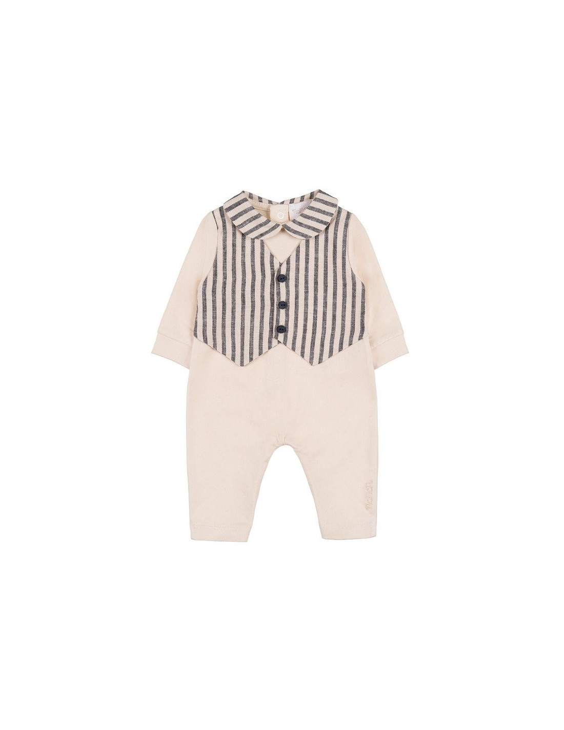 Deliziosa tutina in cotone, impreziosita dal colletto e dal gilet rigati. Abbottonatura inferiore e posteriore.