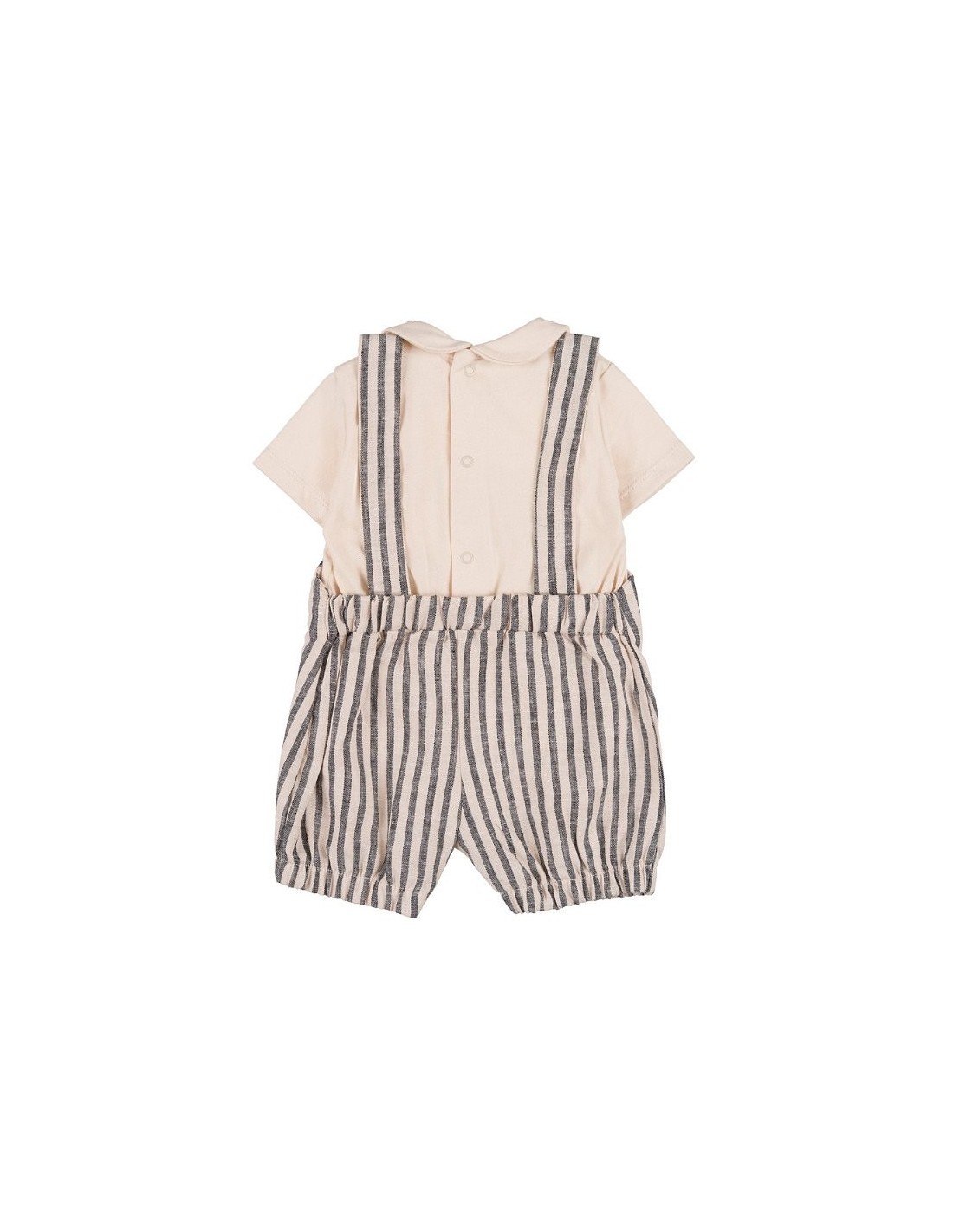Pagliaccetto con colletto, impreziosito dalla dolce salopette rigata. Abbottonatura posteriore e inferiore.
