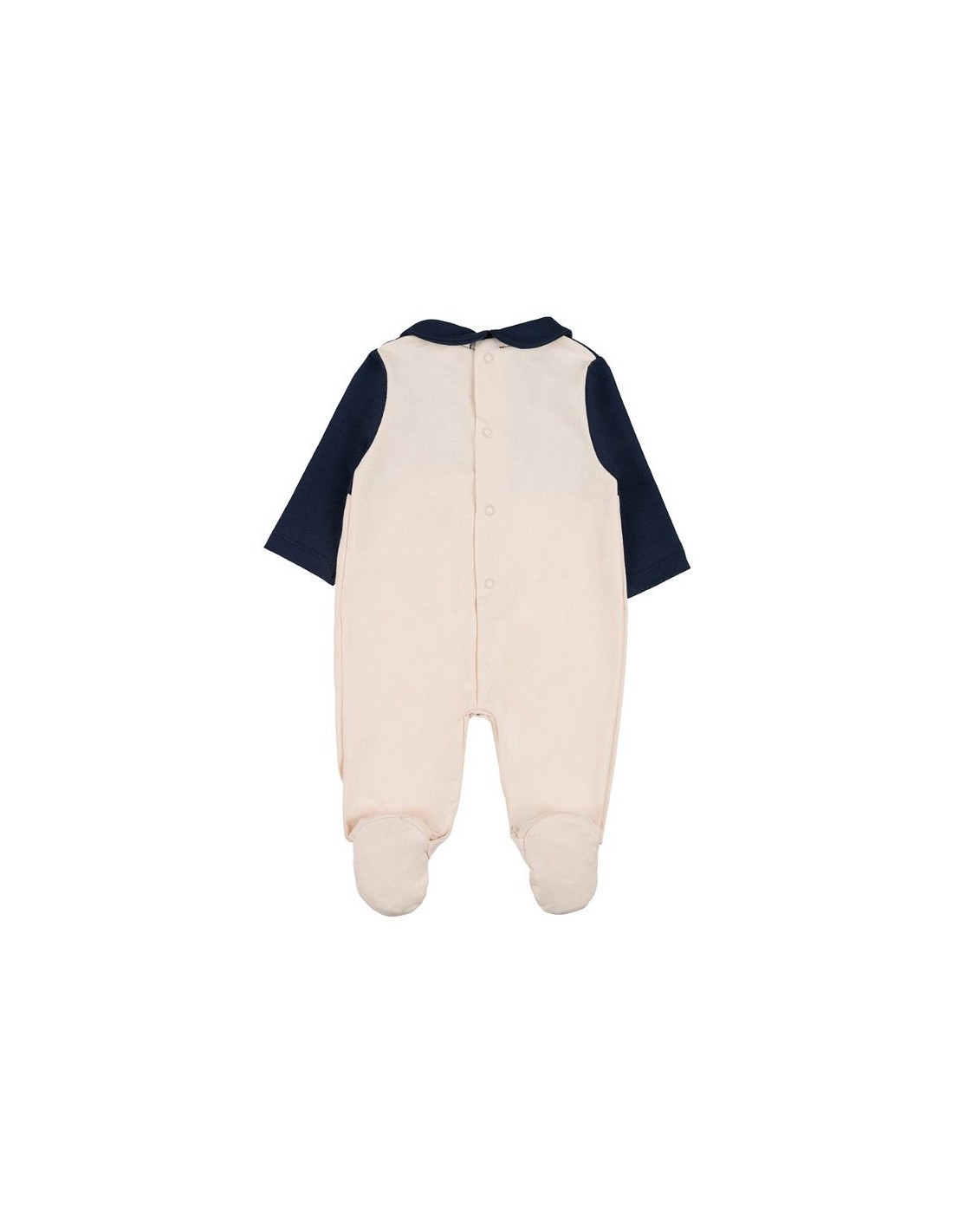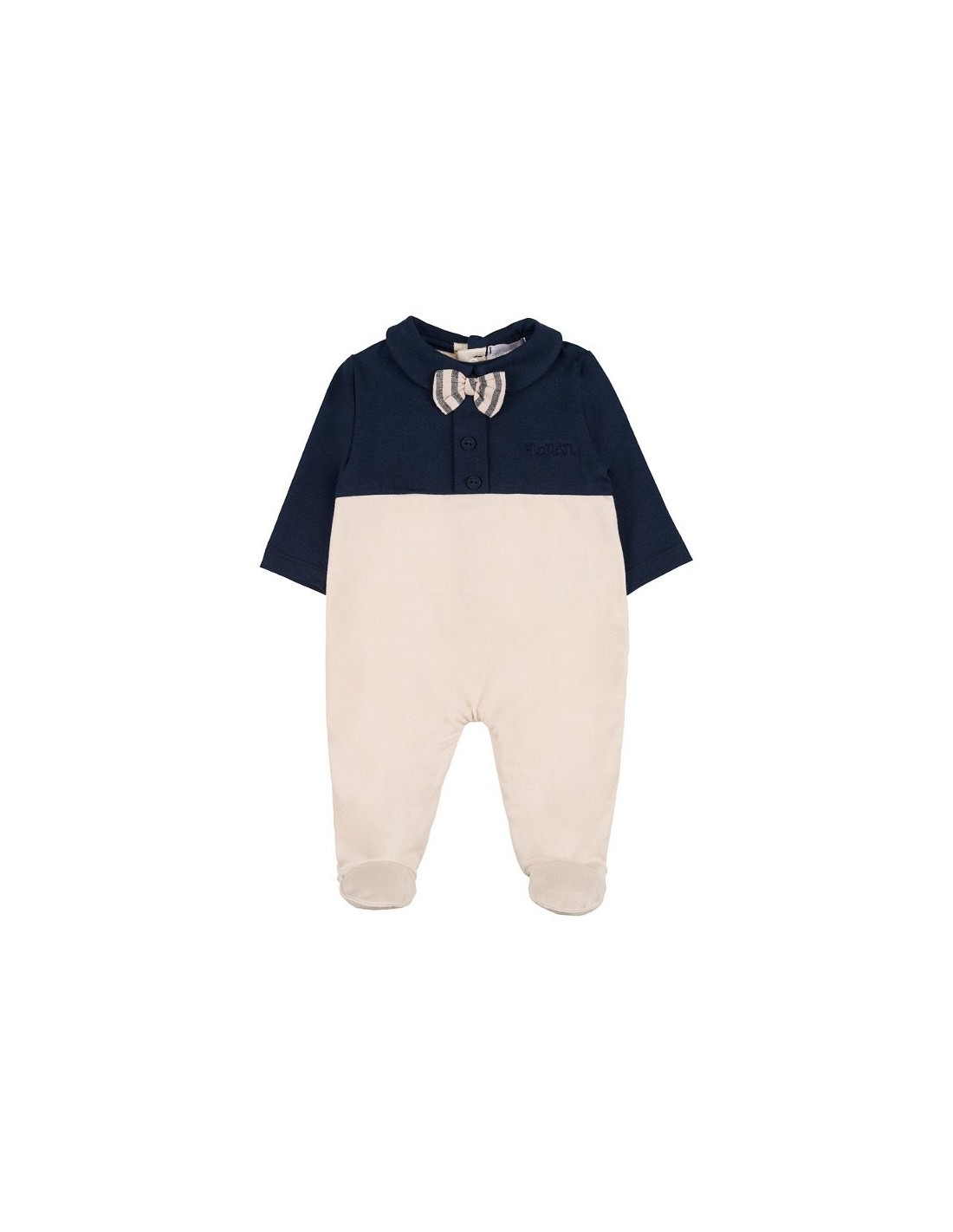 Deliziosa tutina bicolore in cotone, impreziosita da un papillon a righe e due bottoncini frontali. Abbottonatura inferiore e posteriore.
