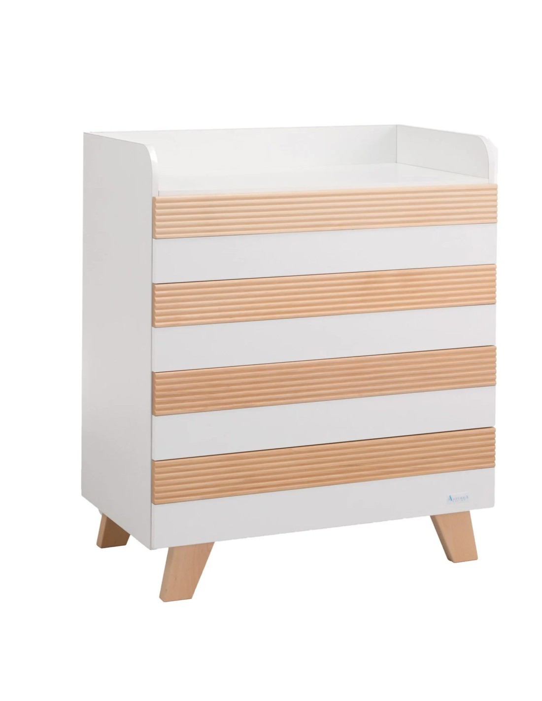 Comoda cassettiera per contenere i cambi del neonato, colore neutro per qualsiasi ambiente. Piano fasciatoio con bordino laterale.