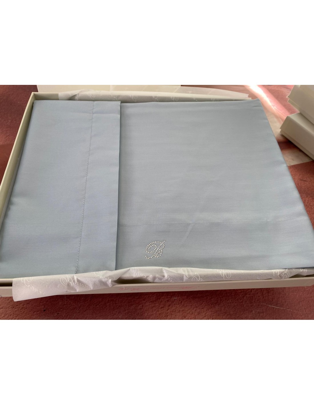 -Lenzuolo sopra cm. 90 x 120 in raso tinta unita con logo in cristalli
