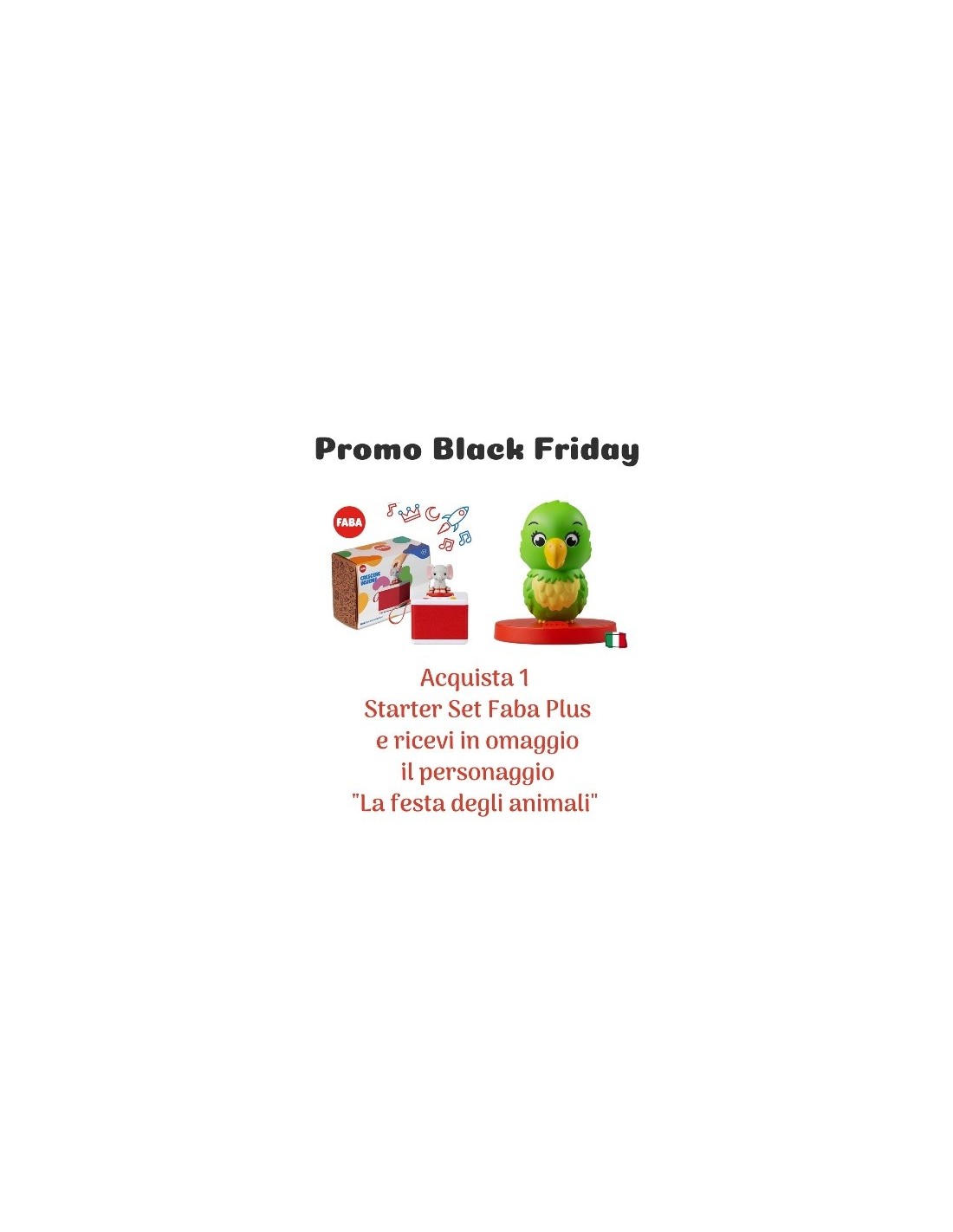 La promo Black Friday include: raccontastorie Faba con personaggio Ele Elefante, Cavo USB-C, personaggio "La Festa degli Animali" Omaggio