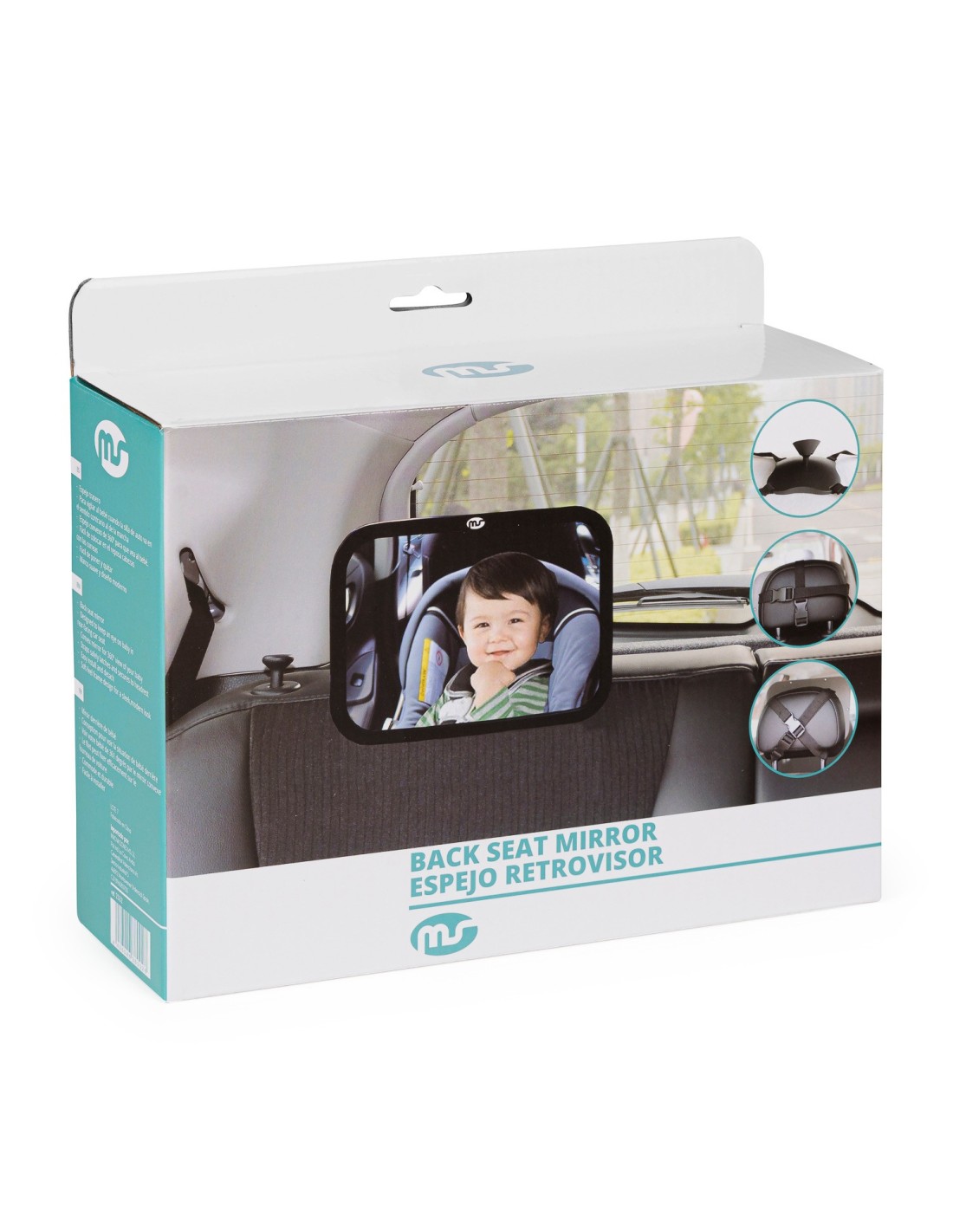 Specchio retrovisore del sedile posteriore multidirezionale. Disegnato per permettere di tenere sott’occhio il bambino seduto sul seggiolino in posizione di contromarcia. Specchio convesso che permette visione del bebé a 360º. Cinghie e passanti che bloccano lo specchio al poggiatesta. Leggero e durevole.