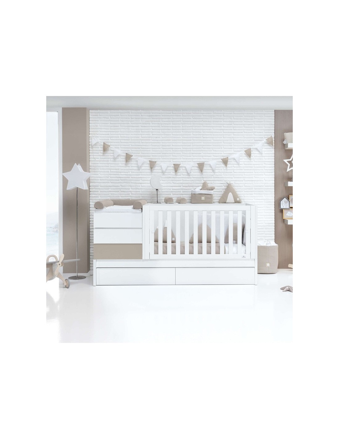 Una volta terminato il suo utilizzo come lettino, può essere convertito in 4 pezzi diversi che compongono una stanza per bambini completa: Letto, scrivania, comodino 3 cassetti, libreria.