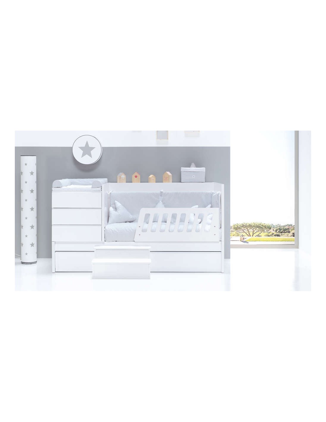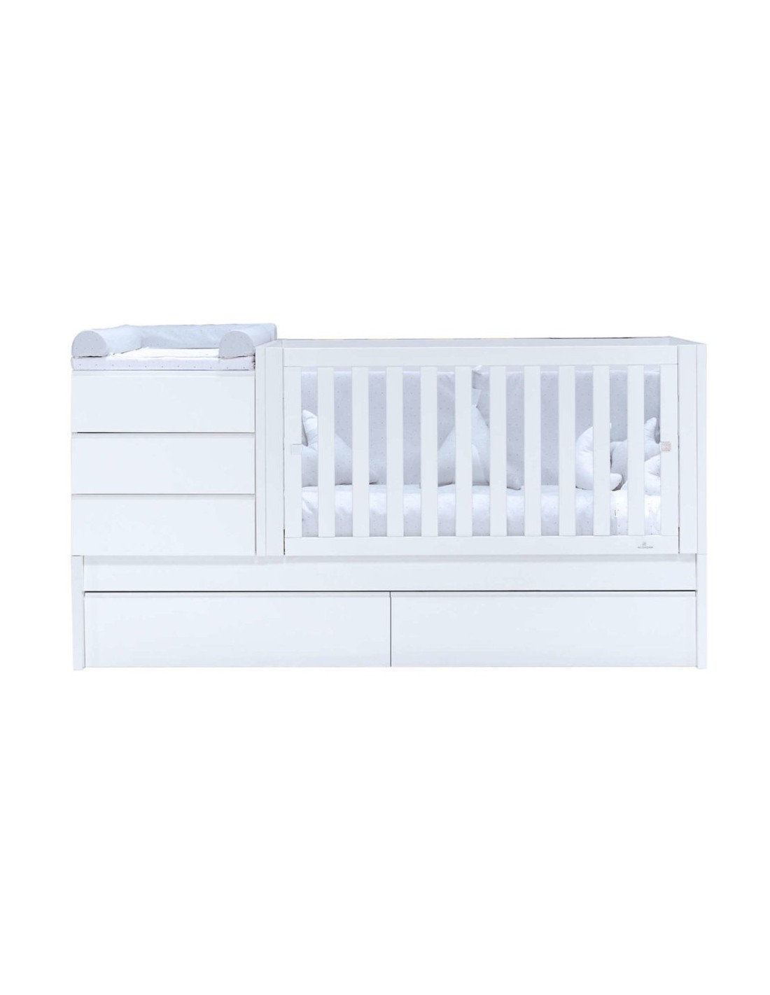 Una volta terminato il suo utilizzo come lettino, può essere convertito in 4 pezzi diversi che compongono una stanza per bambini completa: Letto, scrivania, comodino 3 cassetti, libreria.
