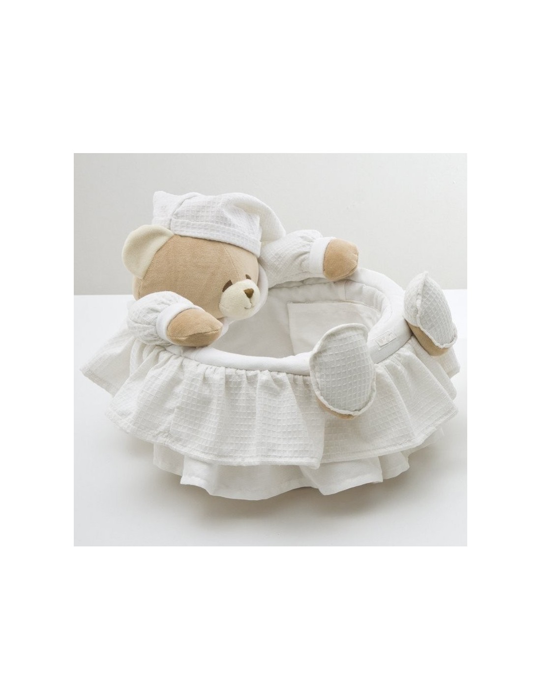 E’ in vimini naturale intrecciato a mano, completamente ricoperti in tessuto piquet di puro cotone.