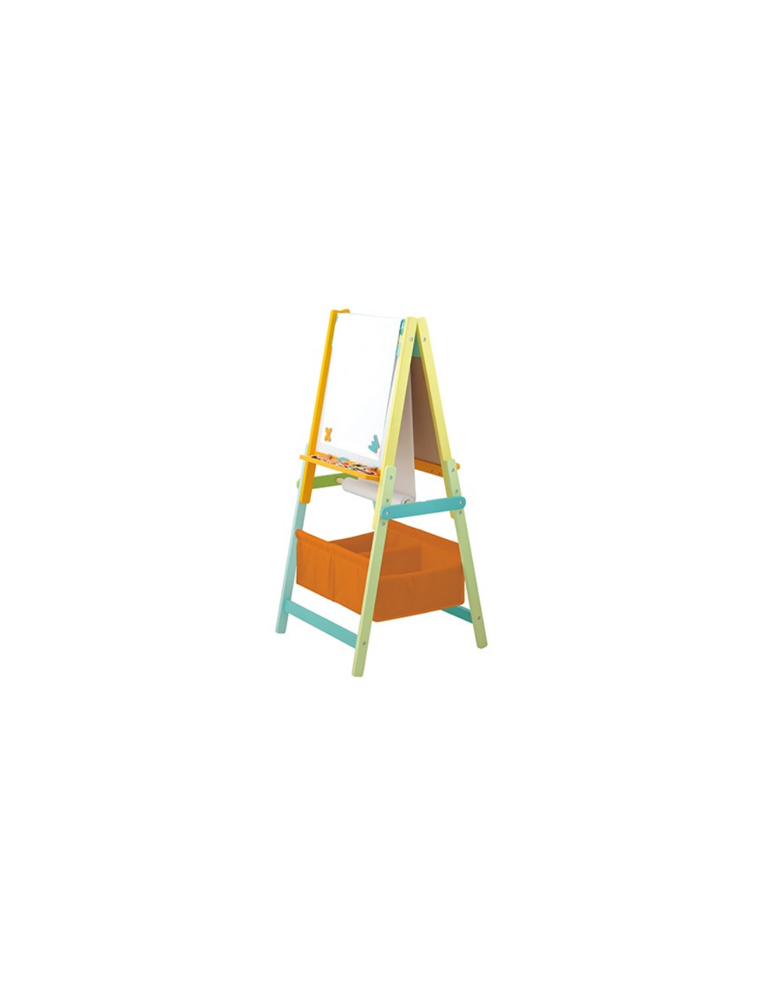 Accessori inclusi: 1 rotolo di carta, 26 lettere magnetiche, 6 gessetti colorati, 1 pennarello, 1 cancellino, partiche tasche portatutto.
