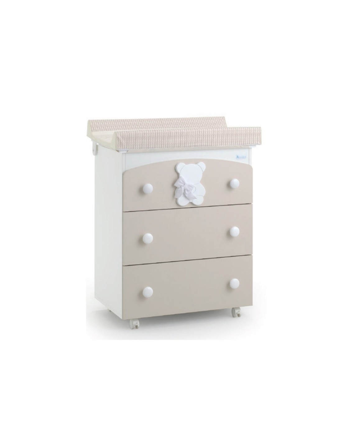 La cassettiera Funky è composta da struttura in legno, con 3 ampi cassetti, il primo ha il bordo più alto e arrotondato sul quale vanno applicati il decori in rilievo raffiguranti teneri orsetti, ogni cassetto è dotato di due pomelli tondi, 4 ruote  gommate per evitare di graffiare il pavimento di cui 2 con freno e vaschetta per il bagnetto del bebè.