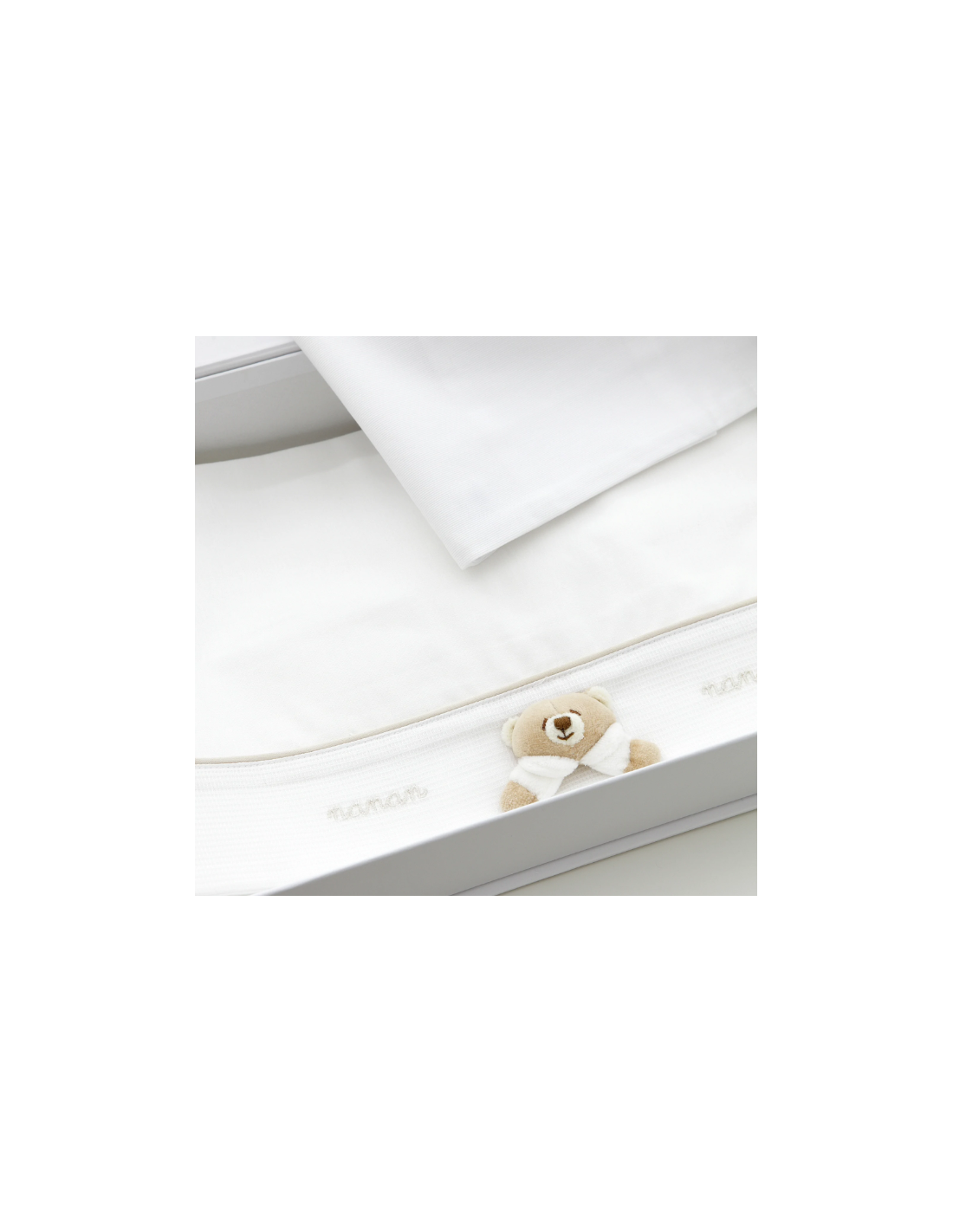 Il set lenzuola carrozzina Nanan Tato Bianco è impreziosito dall’applicazione centrale dell’orsetto Tato in ciniglia e da dolci rifiniture in color panna.