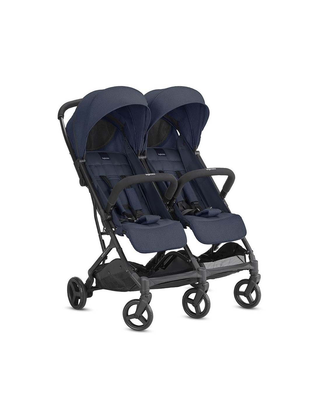 Sedute comode e confortevoli con poggiapiedi regolabili, grandi cappottine con finestrelle di aerazione e con protezione UV 50+ e schienali reclinabili in modo indipendente, si abbinano perfettamente ad un telaio leggero con chiusura compatta e ad un ampio cestino pronto a custodire tutto il necessario del piccolo di casa.