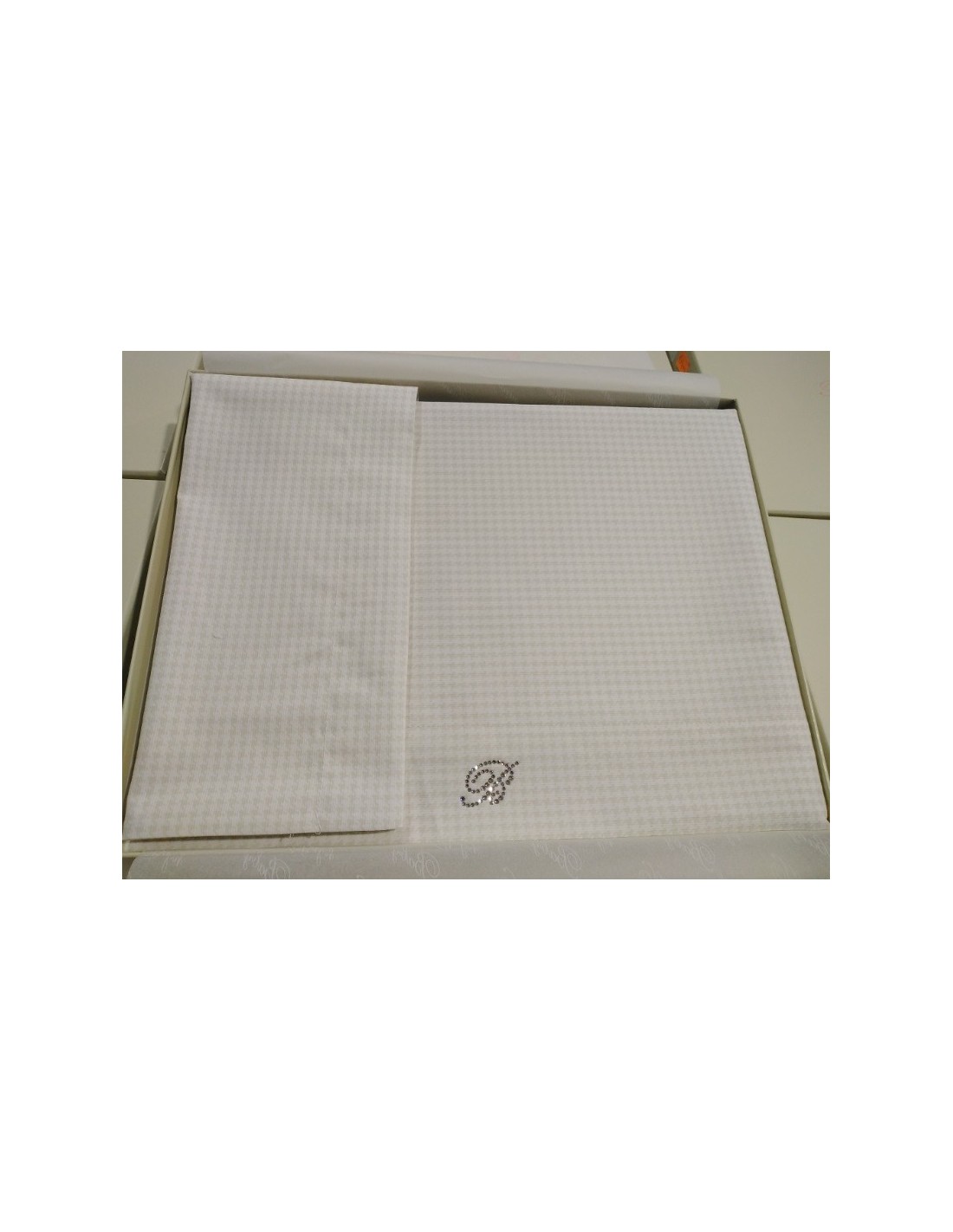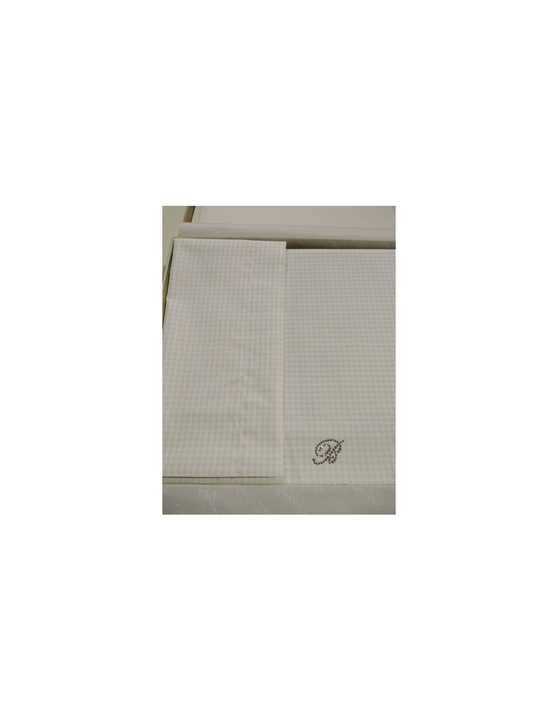 -Lenzuolo sopra cm. 90 x 120 in pied de poule stampato su piquet millerighe con logo in cristalli
