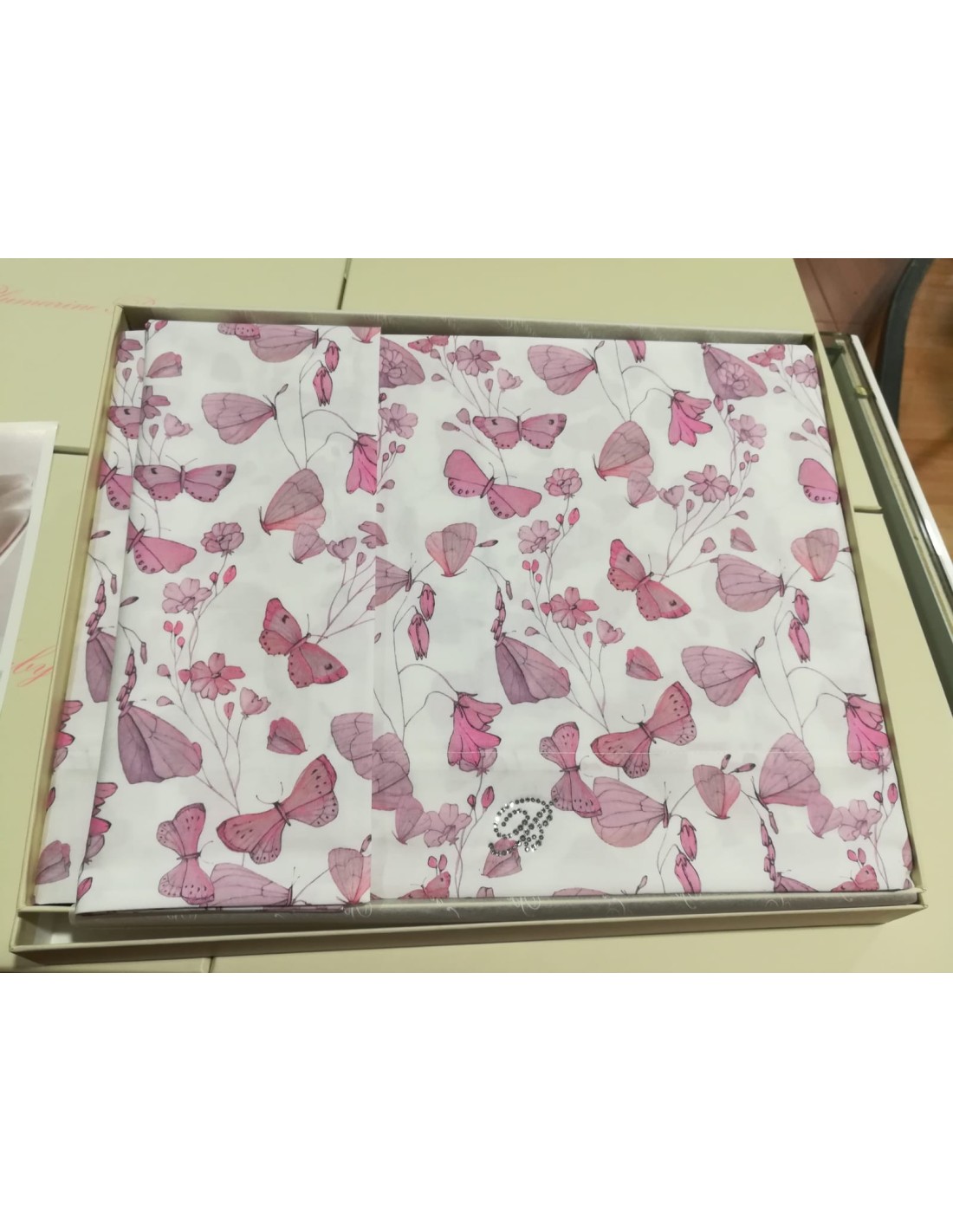 - Lenzuola sopra in percalle stampato e logo in cristalli (90X120 cm)