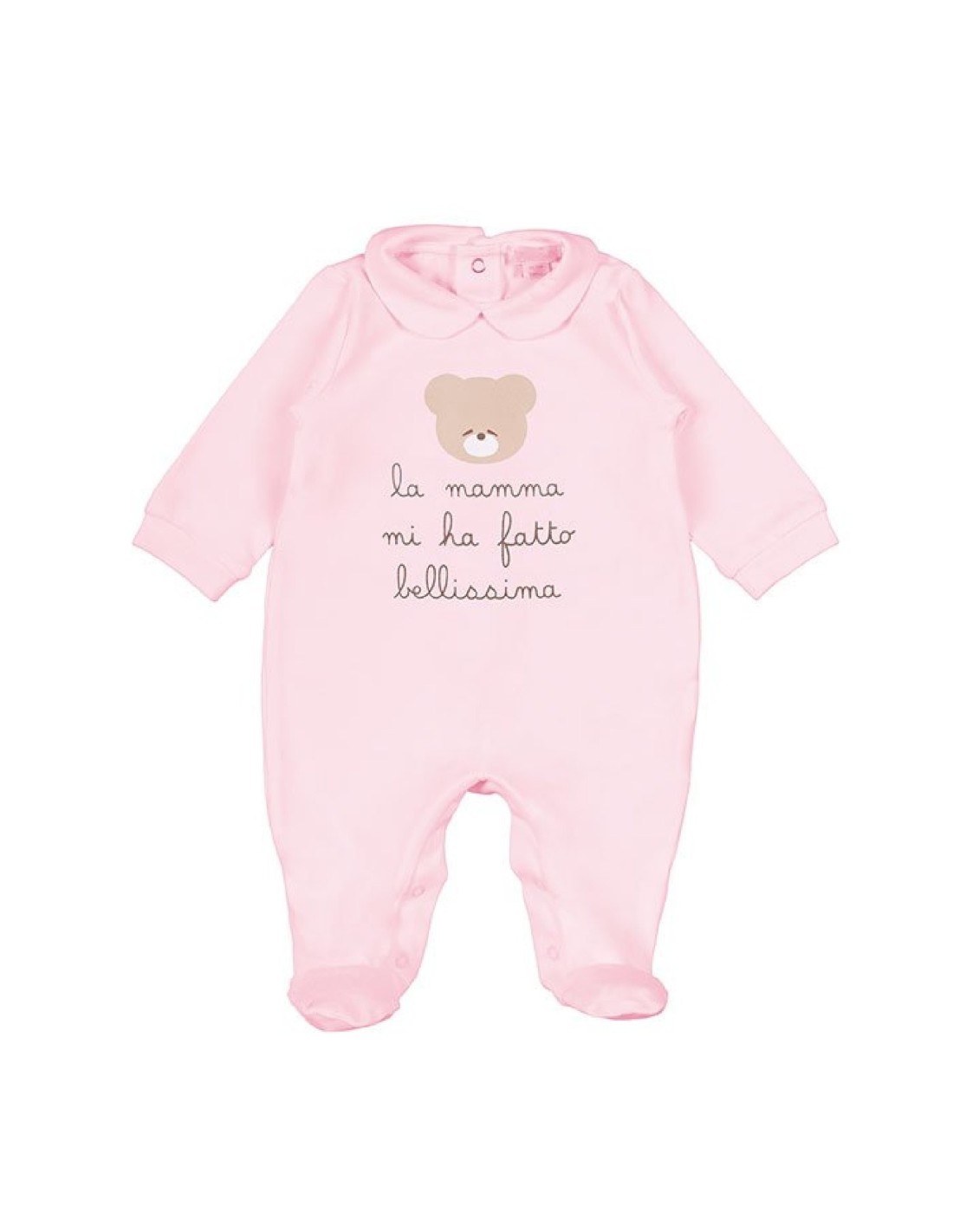 Adorabile tutina rosa impreziosita da dolce orsetto applicato sul fronte e tenera scritta "La mamma mi ha fatta bellissima". Abbottonatura inferiore e posteriore.
