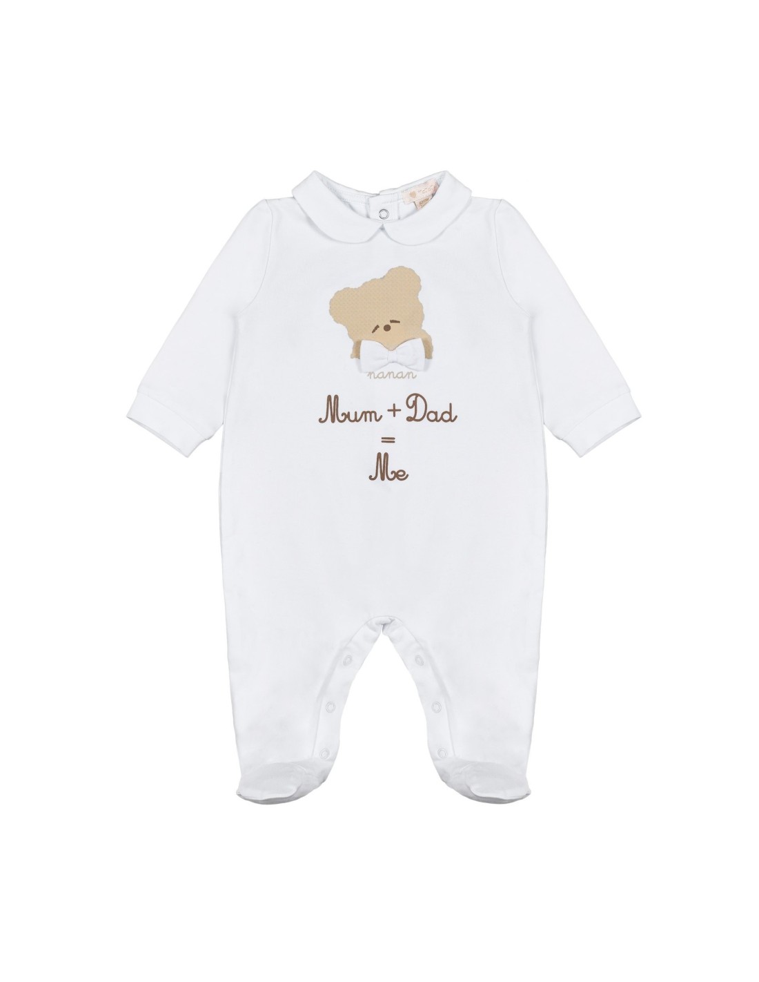 Adorabile tutina bianca impreziosita da dolce orsetto con papillon applicato sul fronte e simpatica scritta “Mum+Dad=Me”. Abbottonatura inferiore e posteriore.