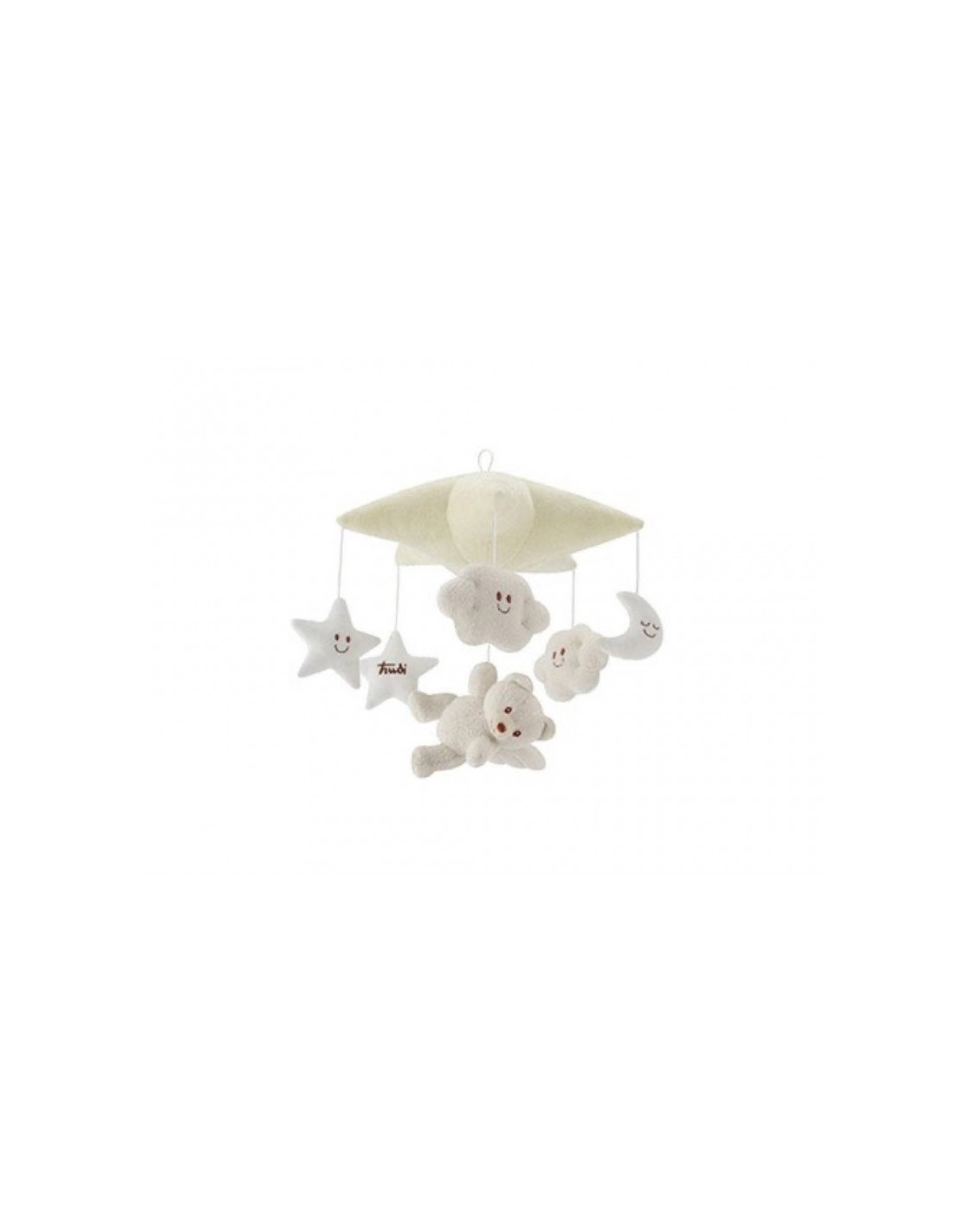 Una dolcissima giostrina pescasogni da appendere sul lettino per accompagnare il bambino nel mondo dei sogni, con le sue graziose nuvolette e il candido orsetto.