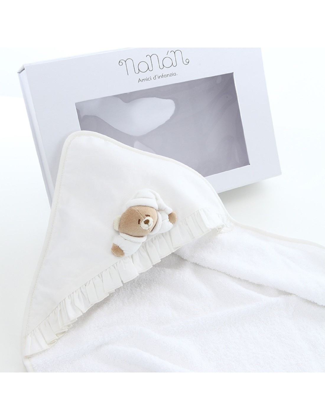 L’accappatoio triangolo Nanan è l’ideale per il bambino appena nato. E’dotato di un un cappuccio con orsetto Puccio/Tato.