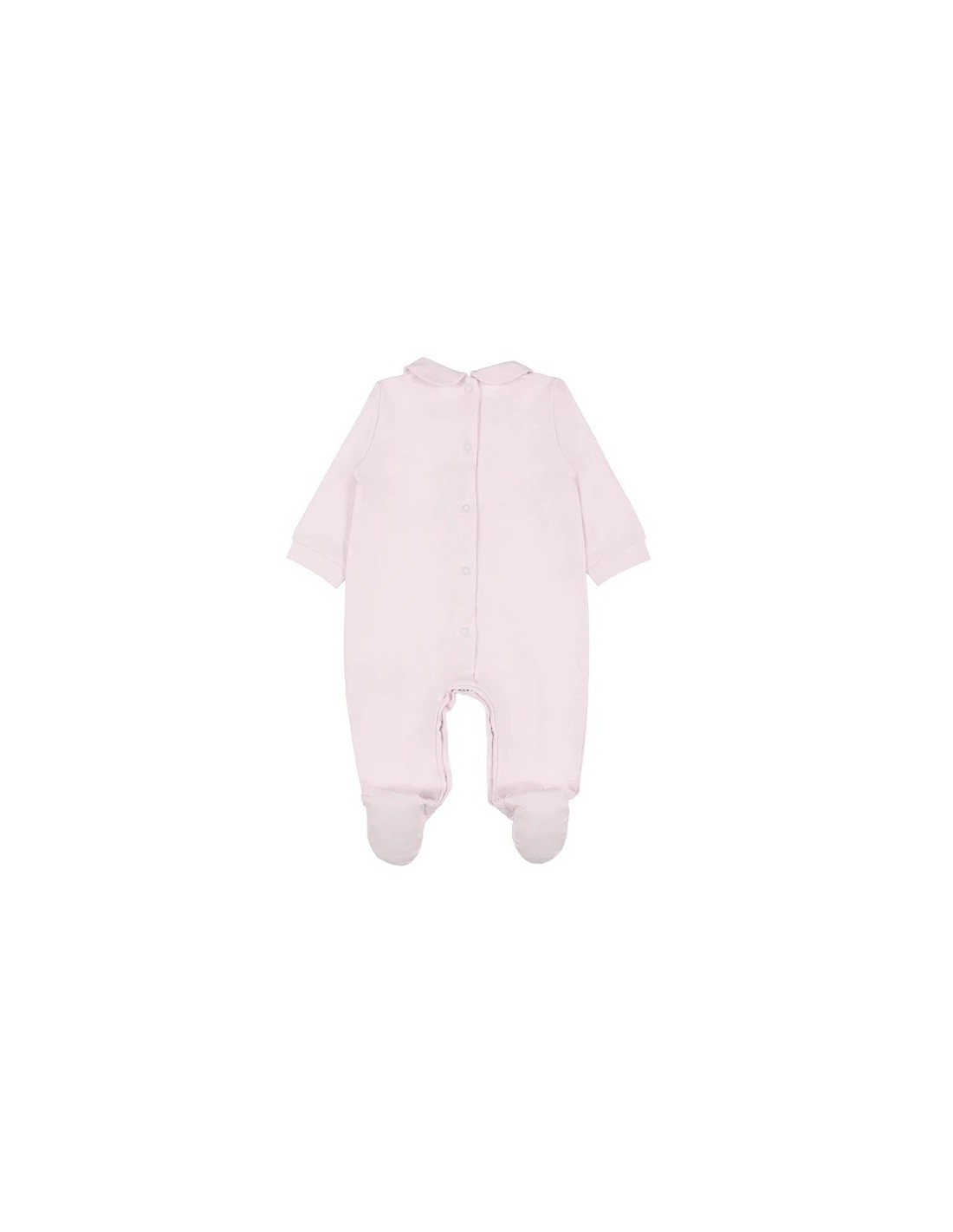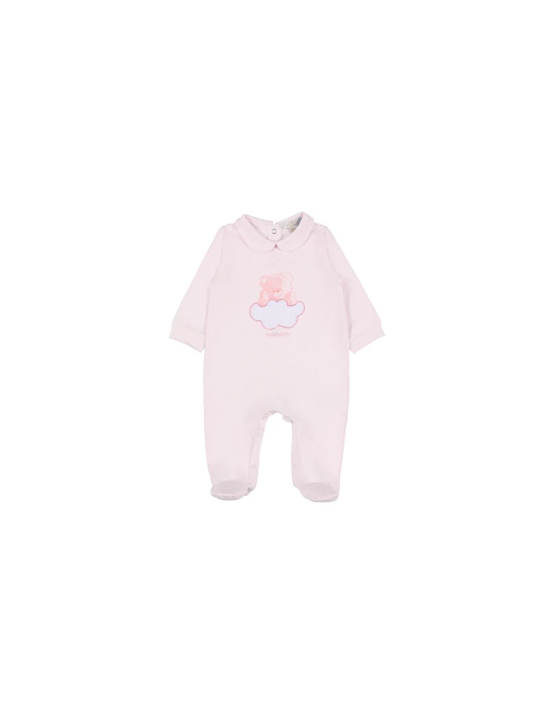 Deliziosa tutina in jersey di cotone con colletto arrotondato, impreziosita da un dolce orsetto e la sua amica nuvoletta della collezione "Orso Nuvola". Due compagni di nanna e di giochi che non faranno mai sentire solo il tuo bimbo. Abbottonatura inferiore e posteriore.