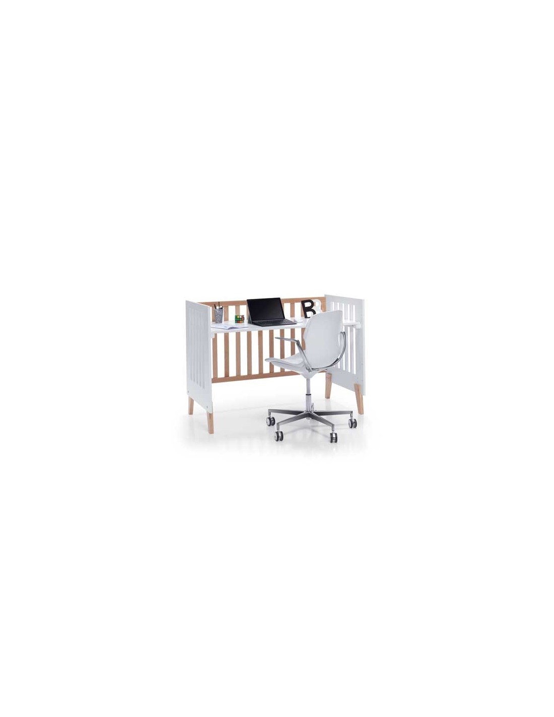 La culla NEXO sin dall’inizio è TRASFORMABILE in una scrivania, quindi in qualsiasi momento puoi convertirla senza la necessità di alcun kit aggiuntivo. Semplicemente rimuovendo la ringhiera laterale e sollevando la struttura a doghe alla massima altezza, Hai una pratica scrivania per bambini che tuo figlio o tua figlia potrà usare a lungo, poiché il piano superiore è di 60×120 cm.