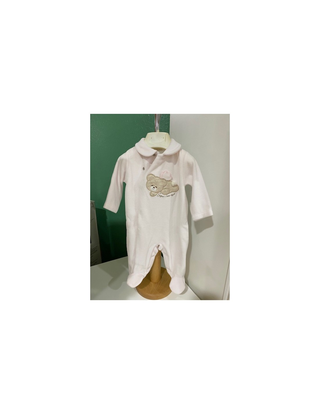 Tutina Nanan in ciniglia aperta davanti, abbellita da un grazioso angioletto della collezione "Tato Angioletto" e dalla scritta "Segui i tuoi sogni". Abbottonatura inferiore e anteriore.