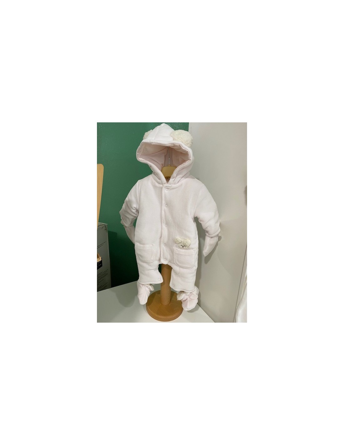 Grazioso tutone imbottito con cappuccio, con tasche frontali e grazioso orsetto.