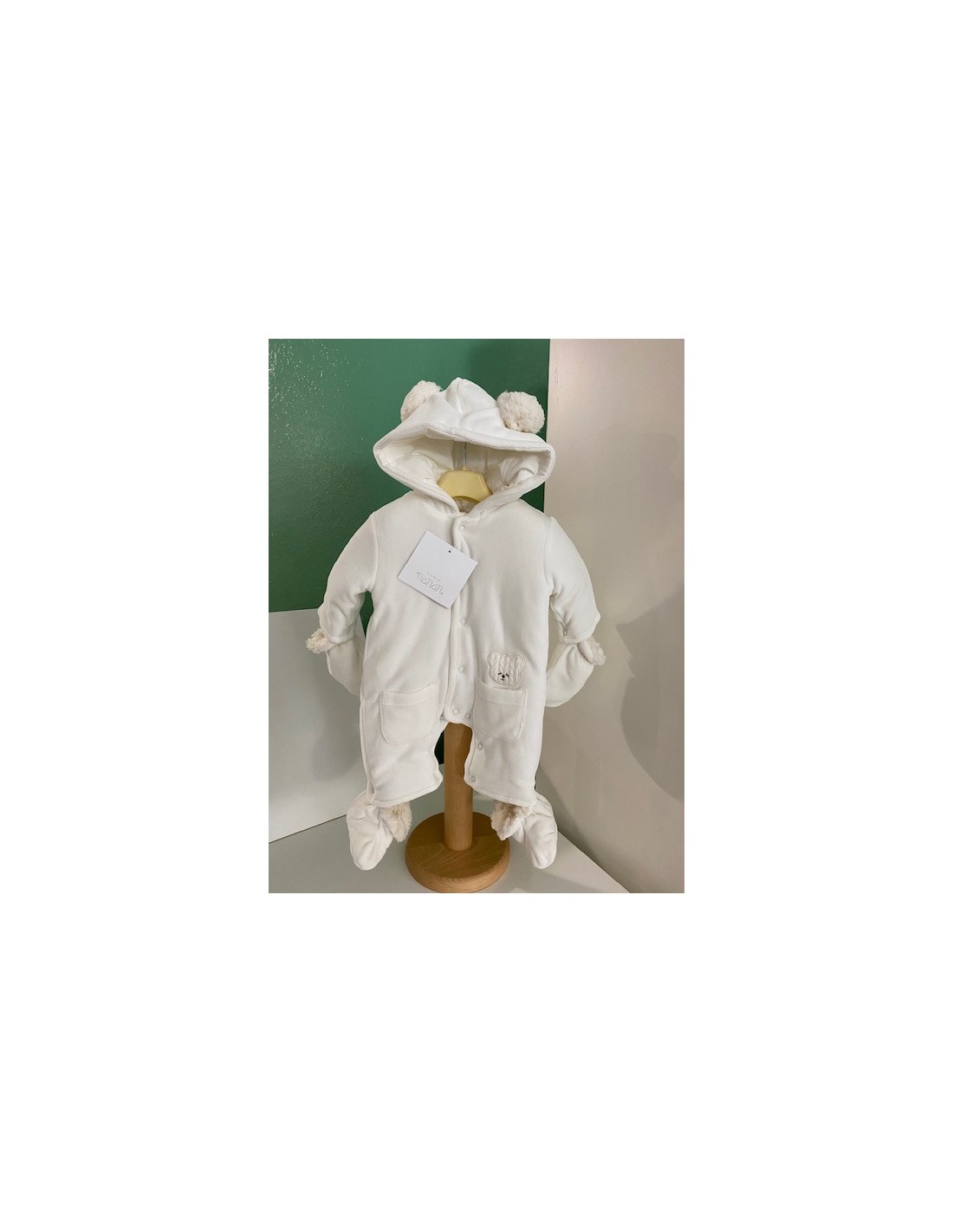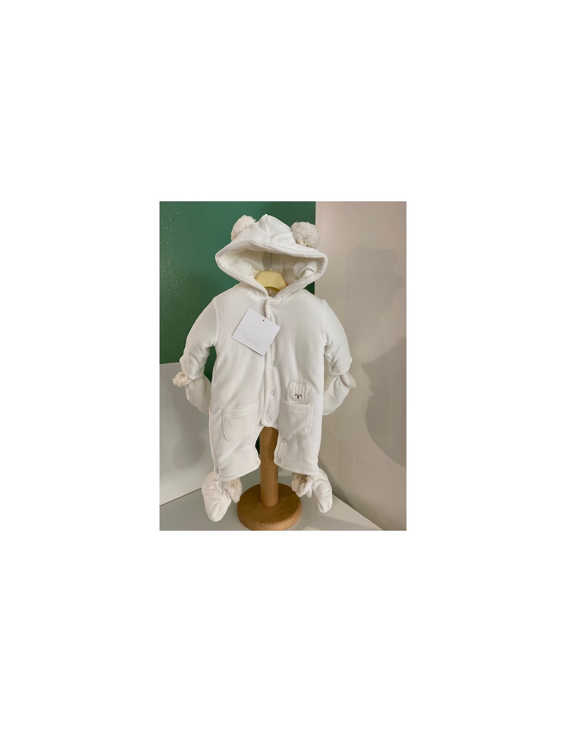 Grazioso tutone imbottito con cappuccio, con tasche frontali e grazioso orsetto.