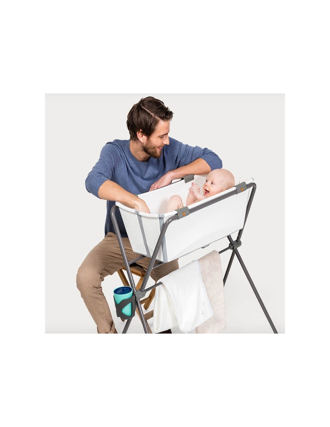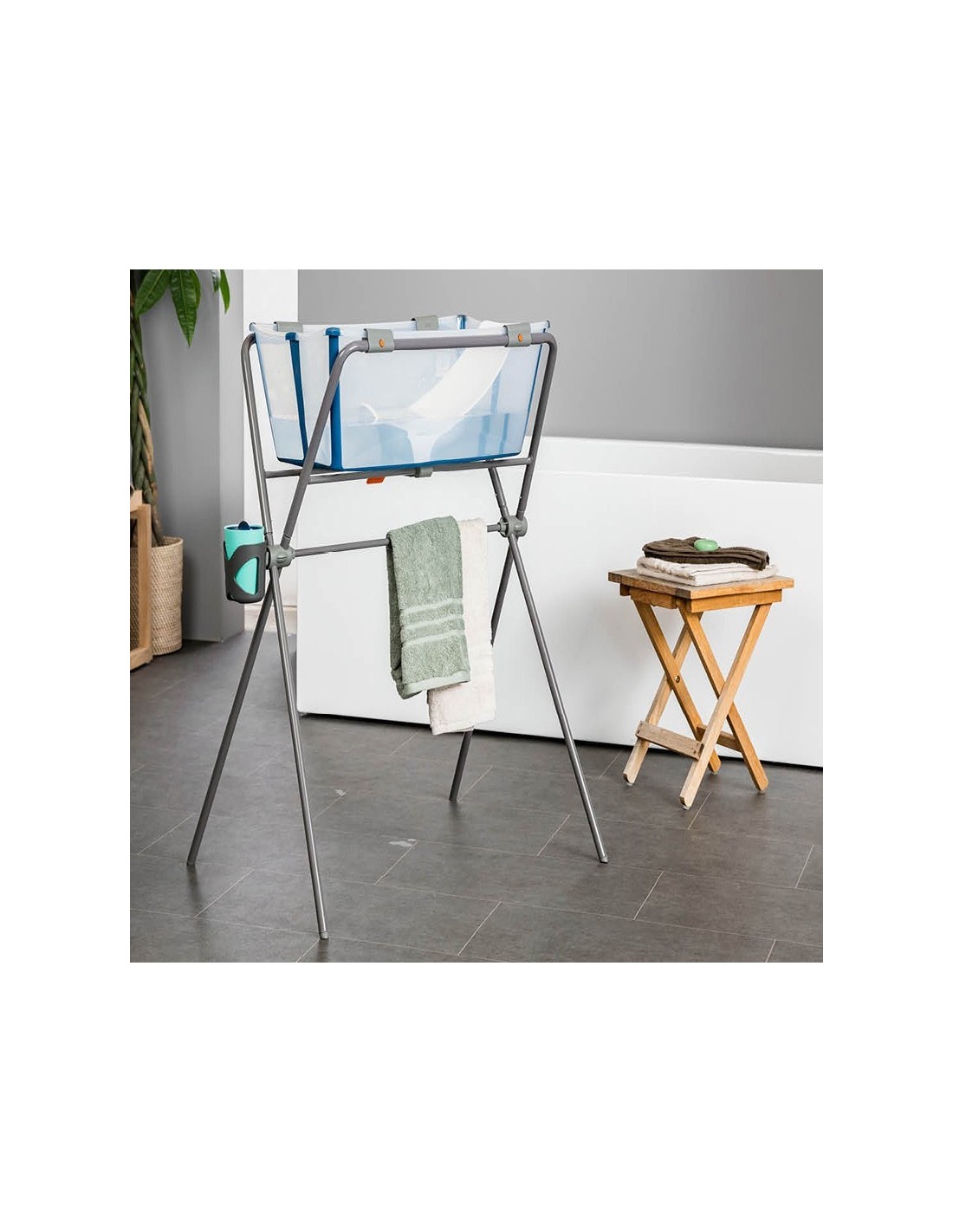 La struttura di supporto è progettata per adattarsi alla vaschetta Stokke Flexi Bath, è sicura, facile da riporre e pratica, per avere tutto a portata di mano. Grazie al blocco della vaschetta, il supporto può rimanere in piedi o essere piegato. È anche uno dei primi supporti a soddisfare le nuove normative europee in materia (EN 17072:2018).