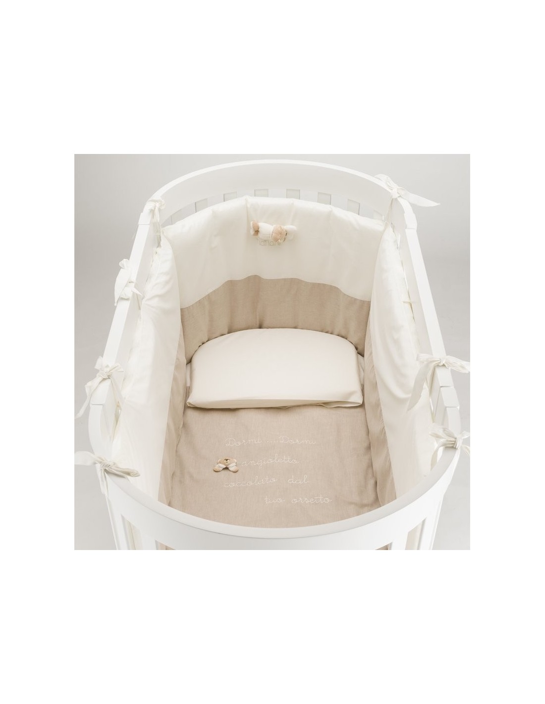 E’ formato da: federa per cuscino, paracolpi imbottito , piumone sfoderabile.