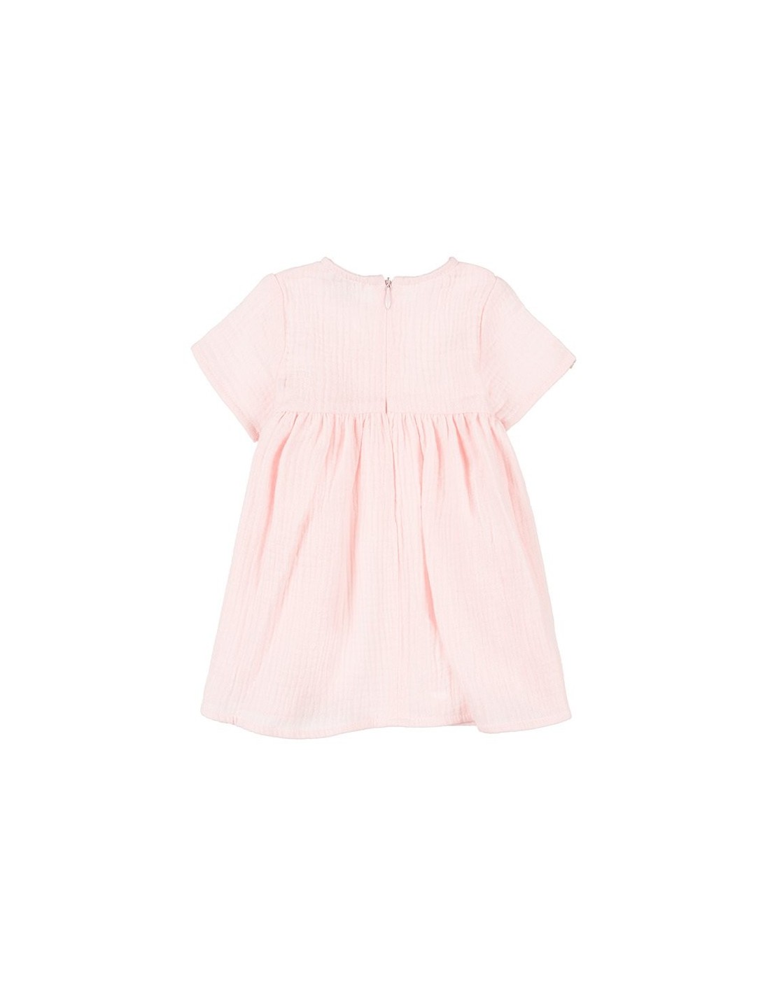 Adorabile abito in garza con scollo rotondo e maniche corte, impreziosito da un dolce fiocco. Apertura posteriore con zip invisibile.