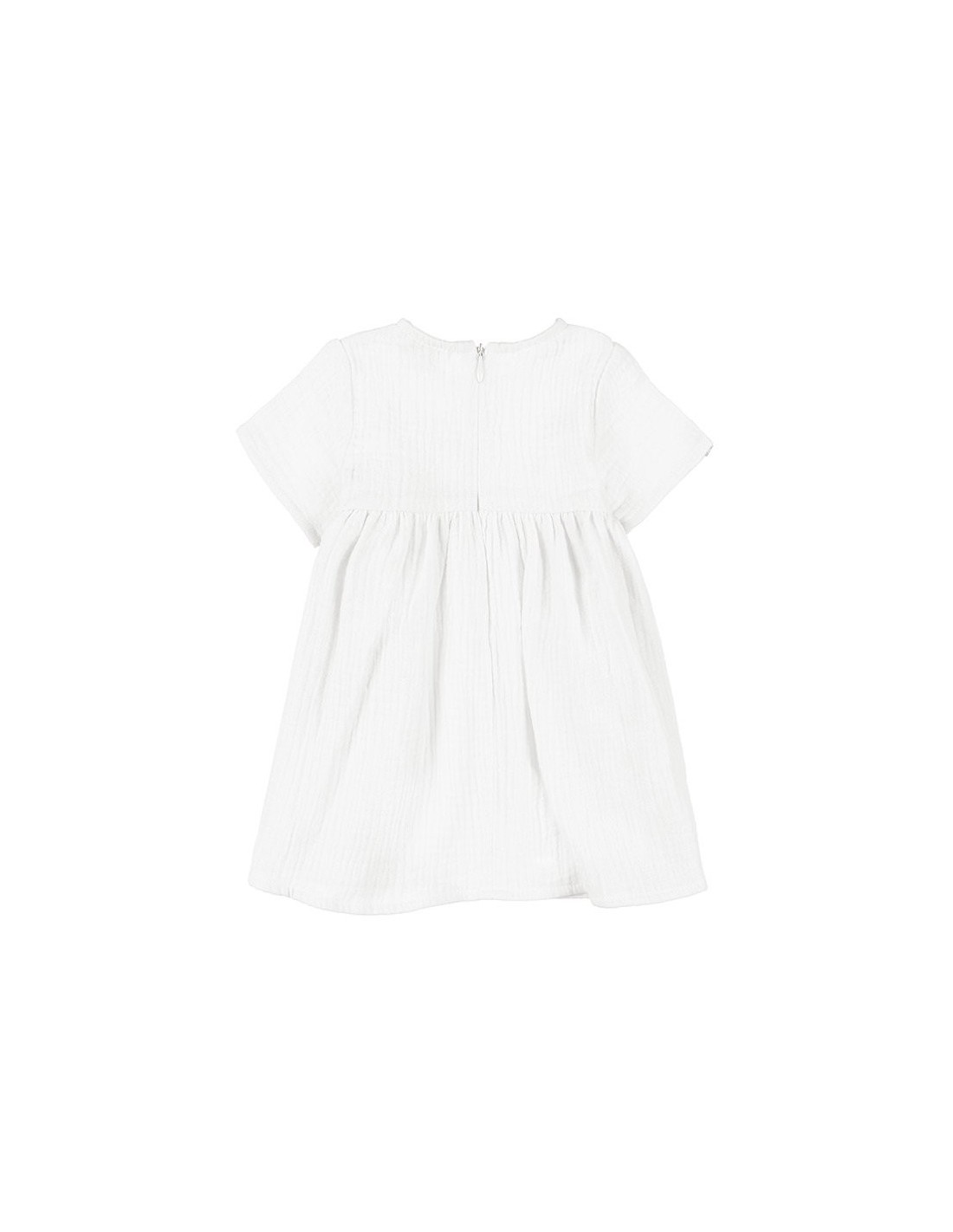 Adorabile abito in garza con scollo rotondo e maniche corte, impreziosito da un dolce fiocco. Apertura posteriore con zip invisibile.