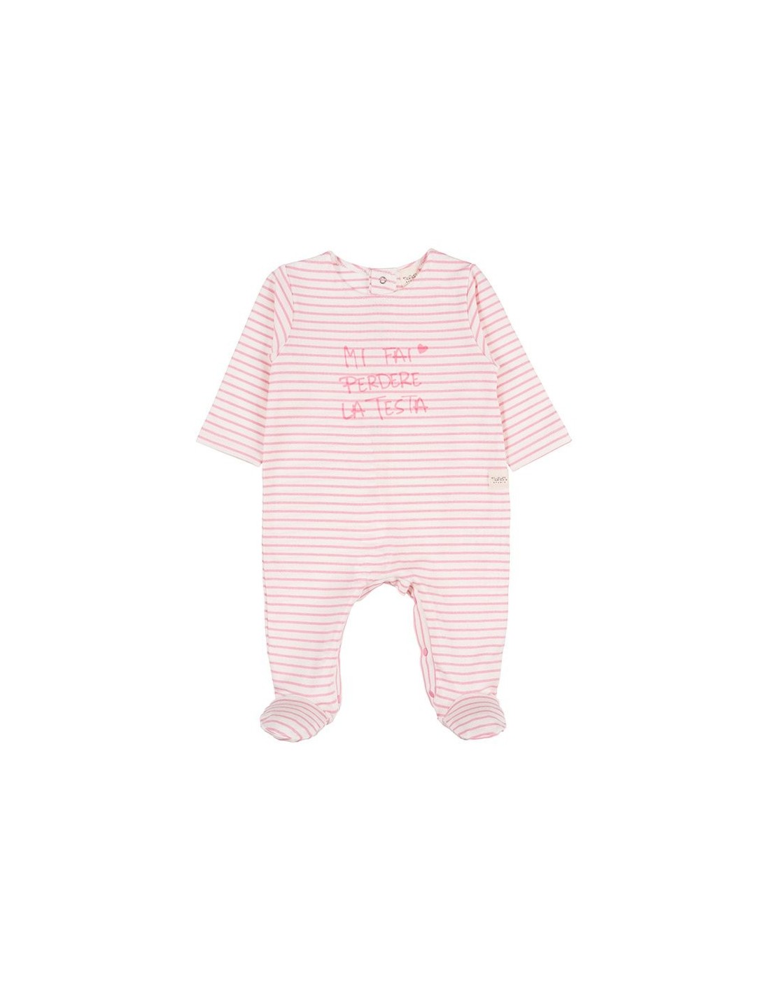 Graziosa tutina in cotone a maniche lunghe rigata di colore rosa, impreziosito dalla dolce scritta centrale "Mi fai perdere la testa". Chiusura con bottoncini a scatto nella parte inferiore e sul retro, rendendo comodo e facile l'indosso.