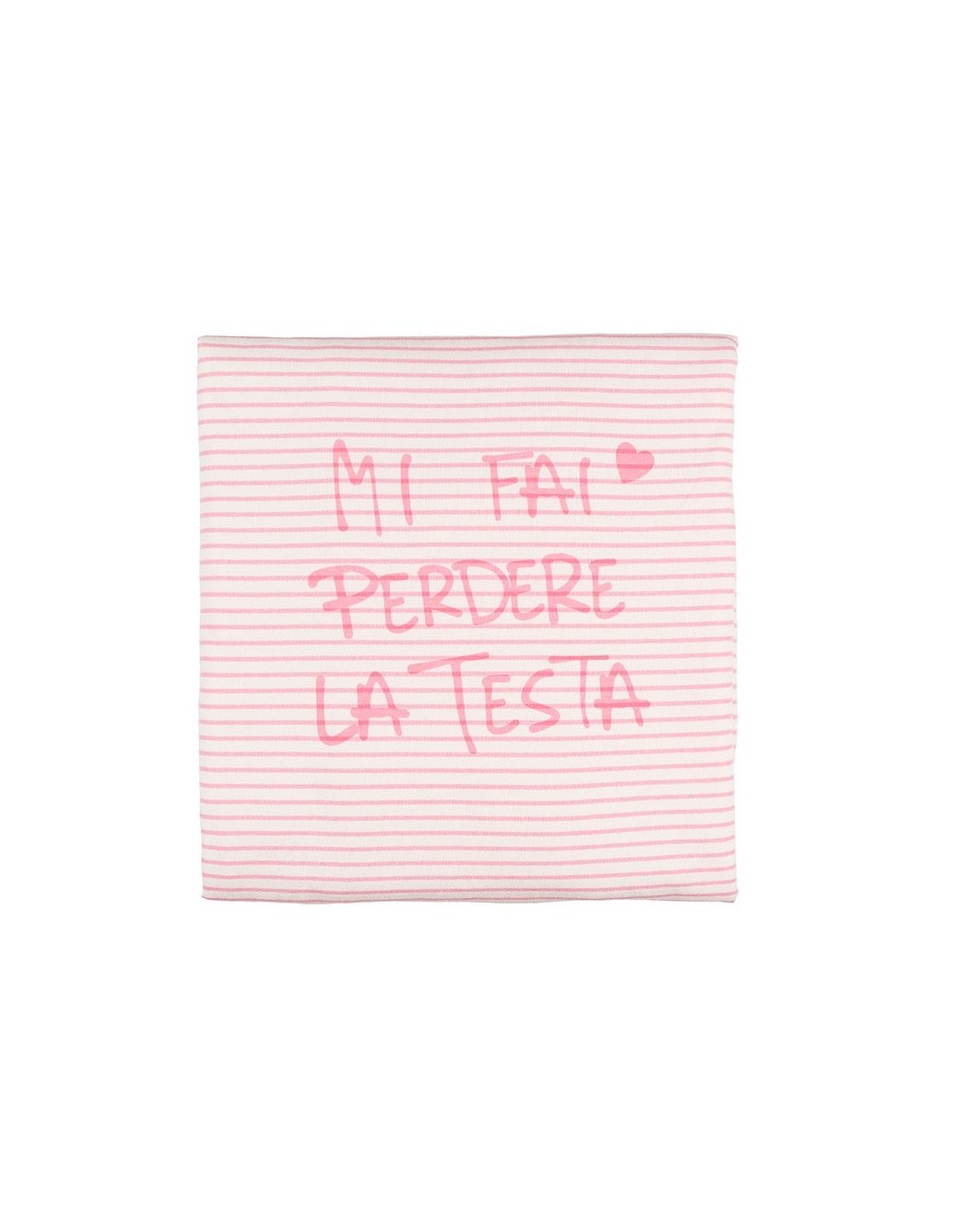 Morbida copertina estiva per carrozzina, rigata di colore rosa, impreziosita dalla tenera scritta nella parte centrale "Mi fai perdere la testa" e dai nodini nei quattro angoli.
