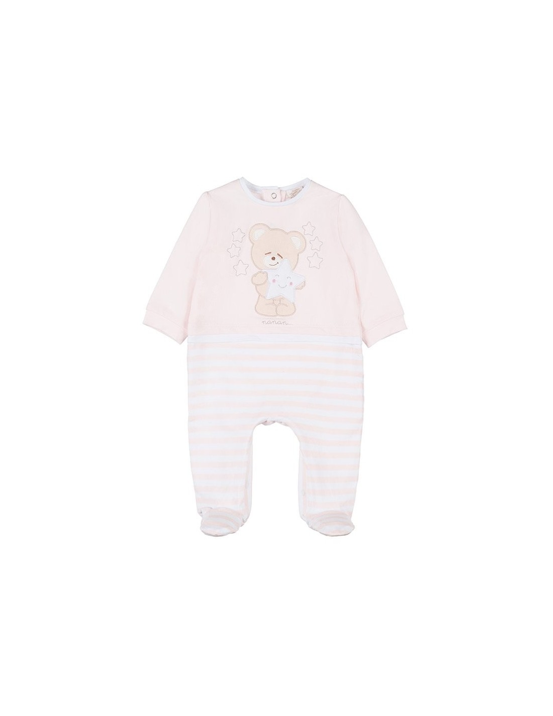 Graziosa tutina a maniche lunghe in jersey di cotone. Nella parte superiore al centro è presente la stampa di un dolcissimo orsetto con la sua amica stella, mentre la parte inferiore si presenta a righe con abbottonatura sul fondo e nel retro con bottoncini automatici.