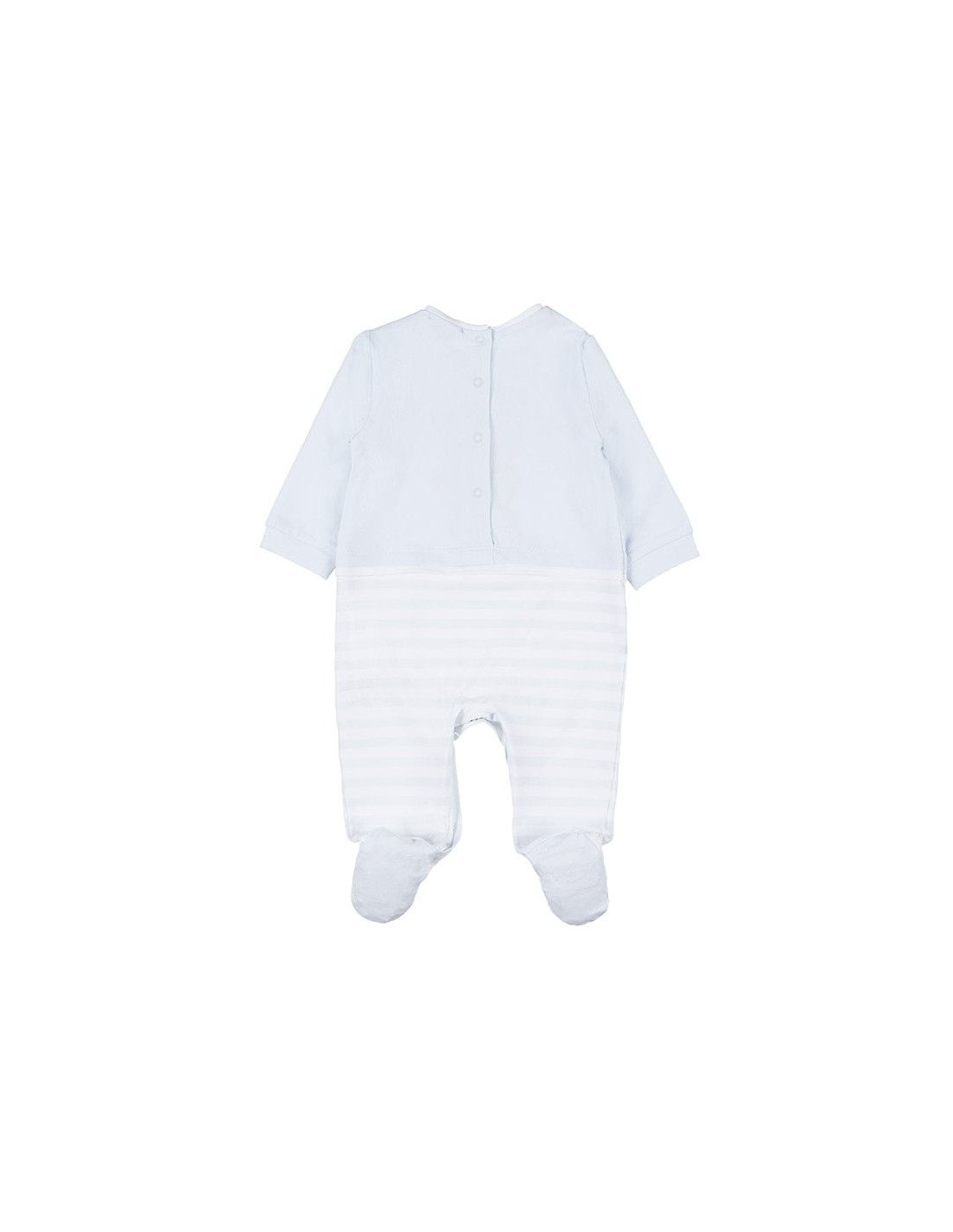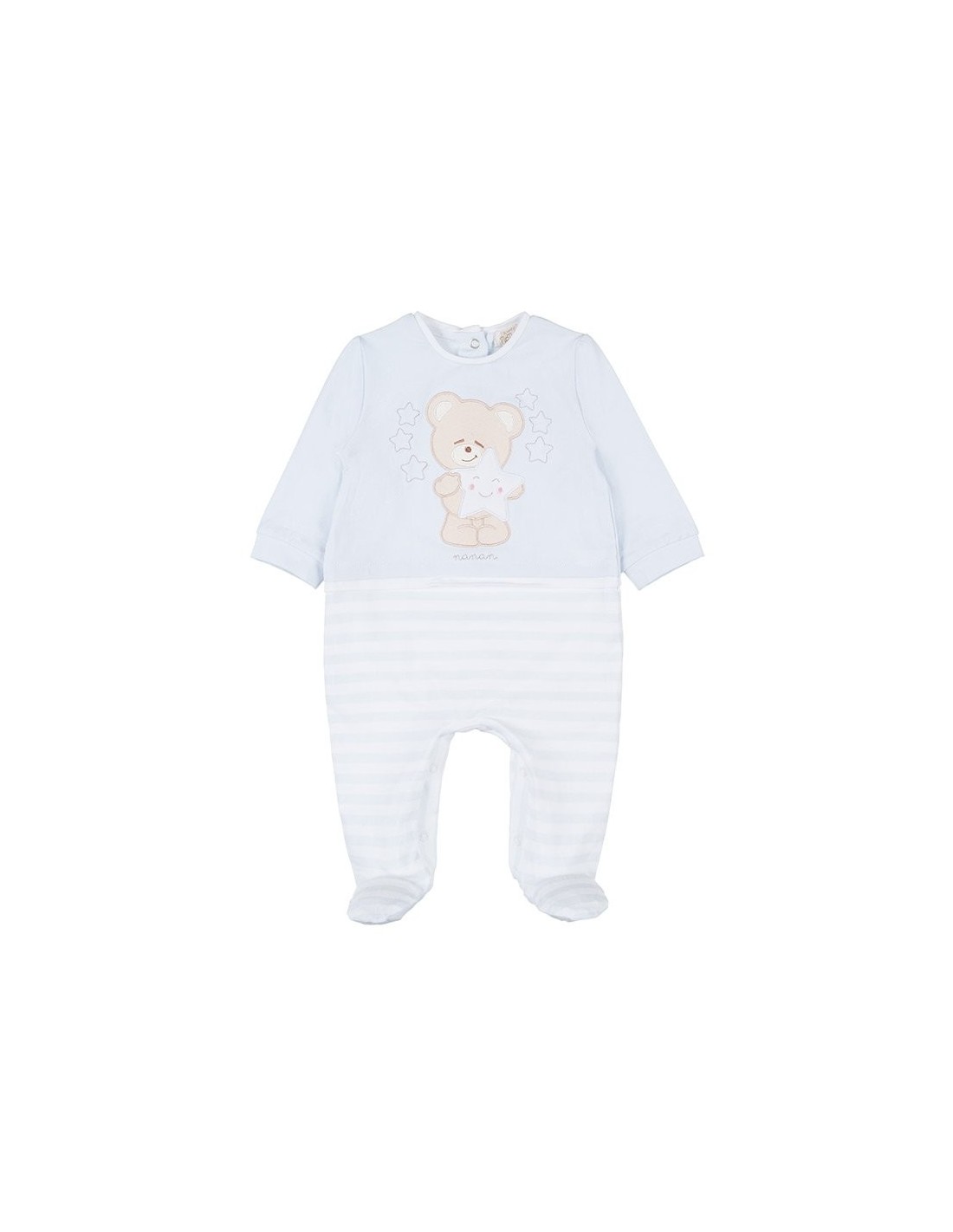 Graziosa tutina a maniche lunghe in jersey di cotone. Nella parte superiore al centro è presente la stampa di un dolcissimo orsetto con la sua amica stella, mentre la parte inferiore si presenta a righe con abbottonatura sul fondo e nel retro con bottoncini automatici.