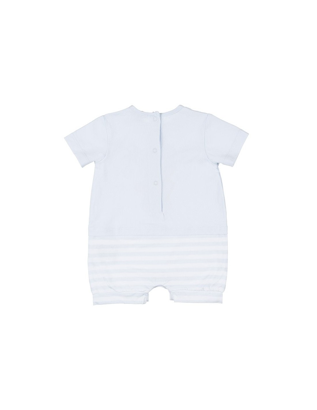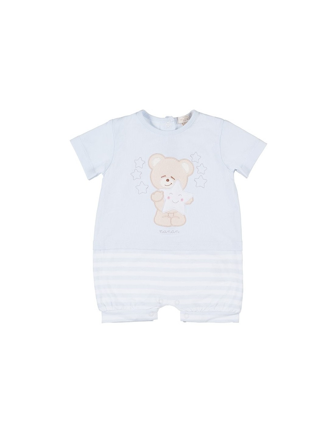 Grazioso pagliaccetto in jersey di cotone composto da una parte superiore in tinta unita, impreziosito dalla stampa centrale di un dolce orsetto con la sua amica stella e dalla parte inferiore a righe. Chiusura con un dolce bottoncino a pressione nella parte inferiore.