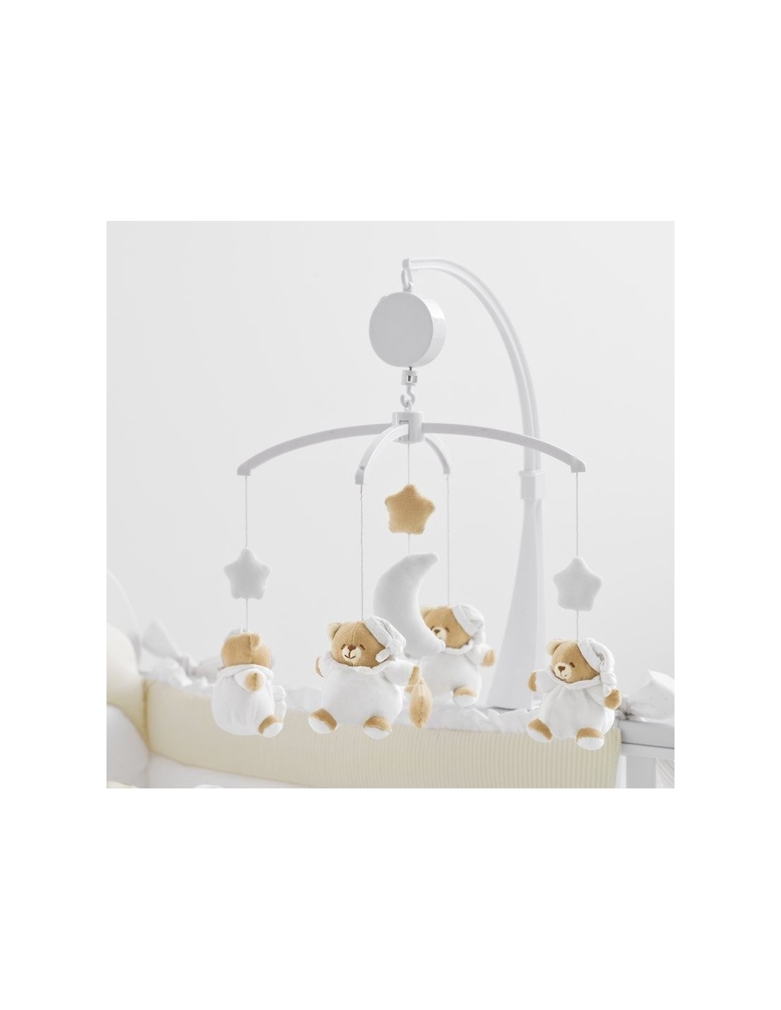 La giostrina Nanan è dotata di quattro teneri orsetti in morbida ciniglia di cotone che creano un girotondo musicale,stimolando le prime percezioni del bambino.