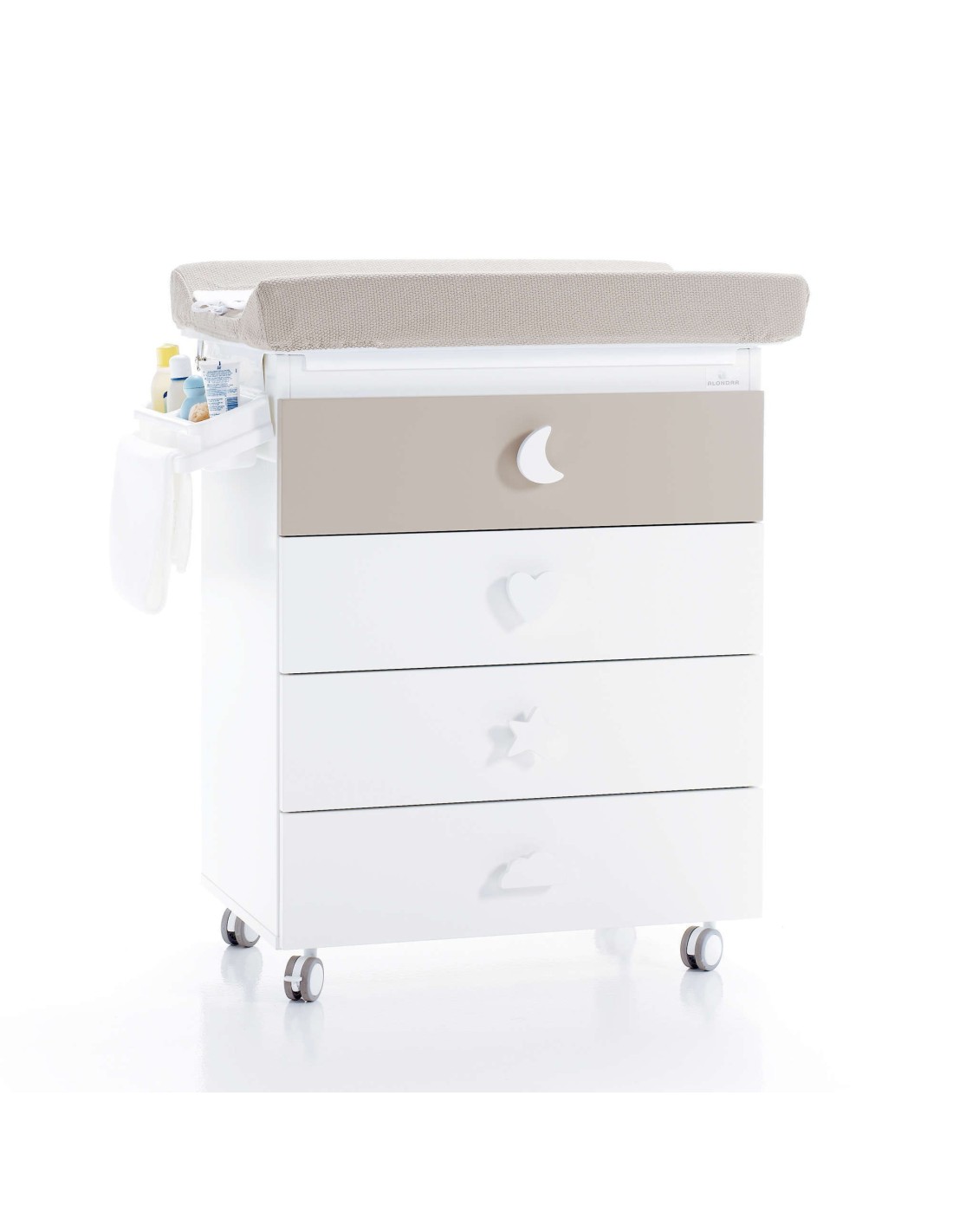 Bagnetto Alondra modello Bubble con cassetti, pomelli e motivi. Composto da quattro cassetti di grande capacità e da un coperchio superiore. Il cassetto superiore non può essere aperto quando è installata la vasca in plastica, ma quando non è più utilizzato come vasca da bagno, il cassetto superiore ha la stessa profondità del resto dei cassetti. Inoltre, incorpora 4 gambe per trasformarsi in una pratica cassettiera per bambini che può essere utilizzata molto più a lungo.
