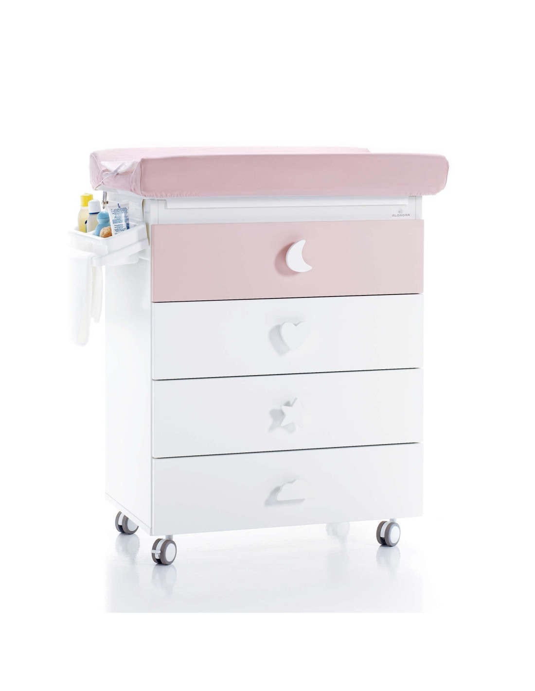 Bagnetto Alondra modello Bubble con cassetti, pomelli e motivi. Composto da quattro cassetti di grande capacità e da un coperchio superiore. Il cassetto superiore non può essere aperto quando è installata la vasca in plastica, ma quando non è più utilizzato come vasca da bagno, il cassetto superiore ha la stessa profondità del resto dei cassetti. Inoltre, incorpora 4 gambe per trasformarsi in una pratica cassettiera per bambini che può essere utilizzata molto più a lungo.