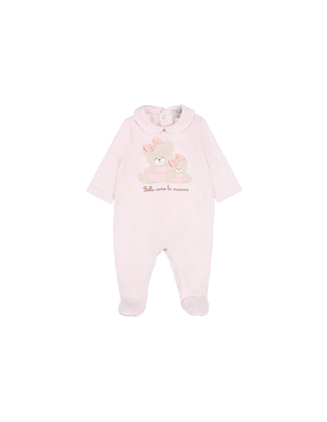 Adorabile tutina rosa impreziosita da 2 orsacchiotte e tenera scritta “Bella come la mamma”. Abbottonatura inferiore e posteriore.