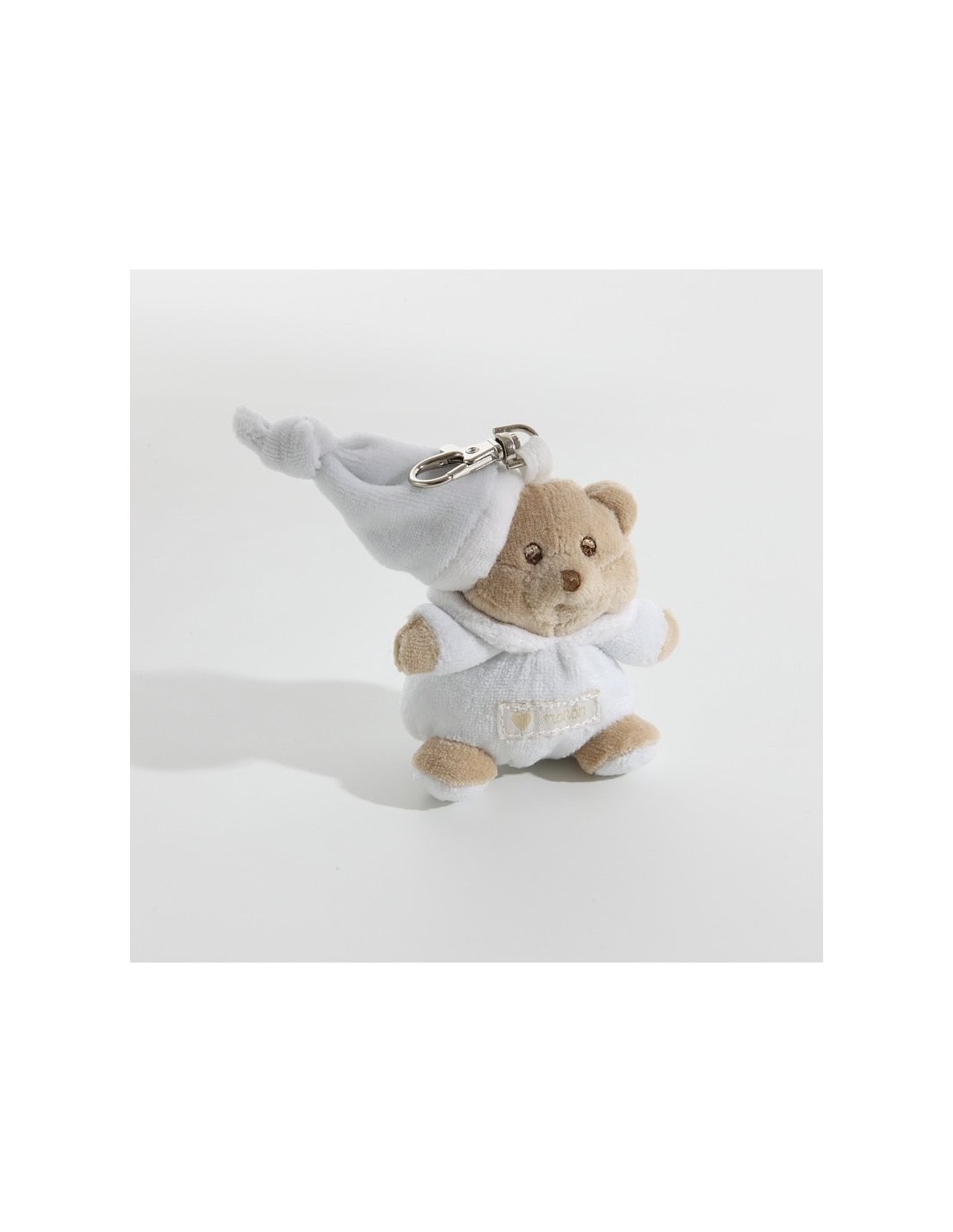 Nanàn ti propone un morbido e candido portachiavi con moschettone, della linea Tato e Puccio, ornato dalla scritta Nanan con un piccolo cuoricino.