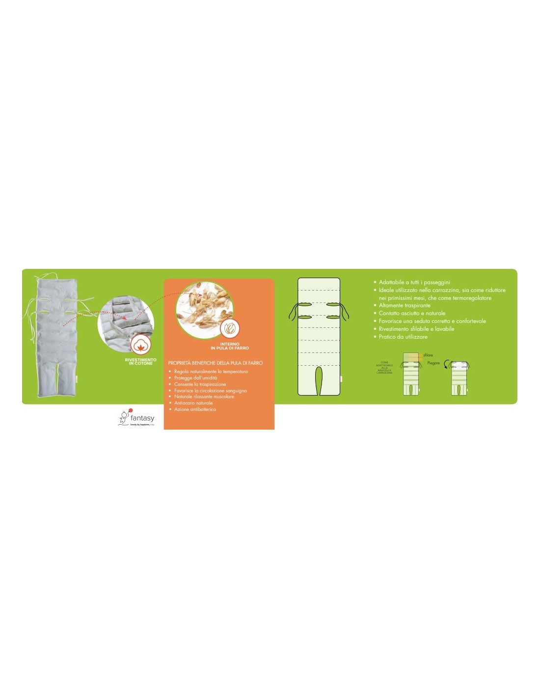 Fresco viaggio Fantasy è un materassino traspirante. Esterno  in spugna indemagliabile di cotone, e interno  in pula di farro da agricoltura biologica.