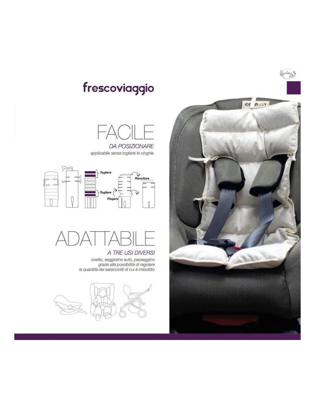 Regolabile in lunghezza togliendo i vari cuscinetti di imbottitura di cui è costituito, così da poter essere utilizzato dall’ovetto al passeggino. Adattabile a 3 usi diversi: ovetto, seggiolino auto, passeggino.