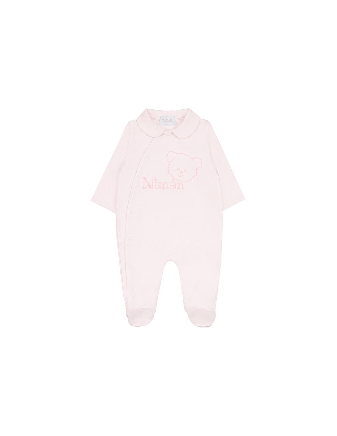Graziosa tutina in jersey di cotone con colletto stondato impreziosita dalla stampa di un dolcissimo orsetto con la scritta “Nanán". L'abbottonatura laterale la rende comoda da indossare e pratica per i movimenti del tuo bimbo.