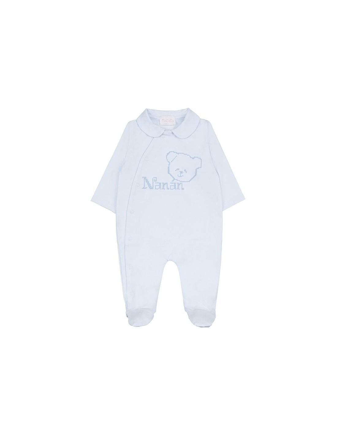 Graziosa tutina in jersey di cotone con colletto stondato impreziosita dalla stampa di un dolcissimo orsetto con la scritta “Nanán". L'abbottonatura laterale la rende comoda da indossare e pratica per i movimenti del tuo bimbo.