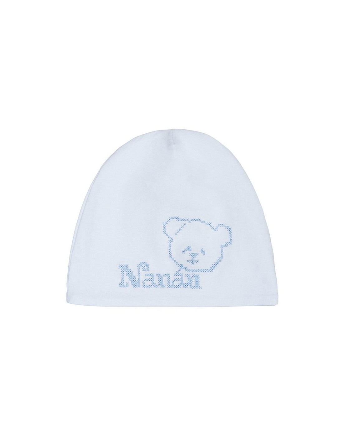 Morbido cappellino in cotone impreziosito dalla scritta “Nanán” e da un dolce orsetto.